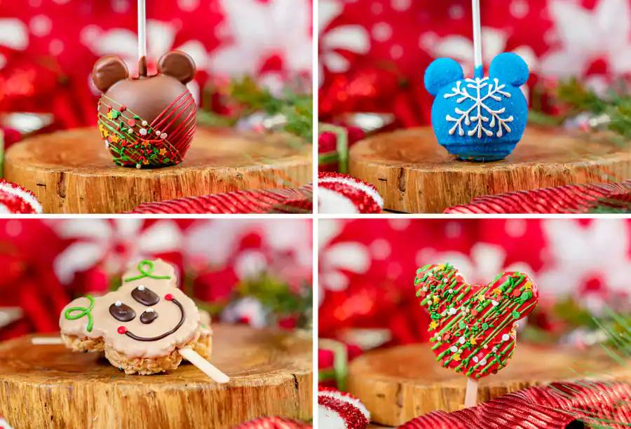 - Holiday Minnie Mouse Cake Pop: Vanilla cake with marshmallow ears, dipped in red-colored white chocolate, drizzled with green-colored white chocolate, and topped with a white chocolate Minnie Mouse bow