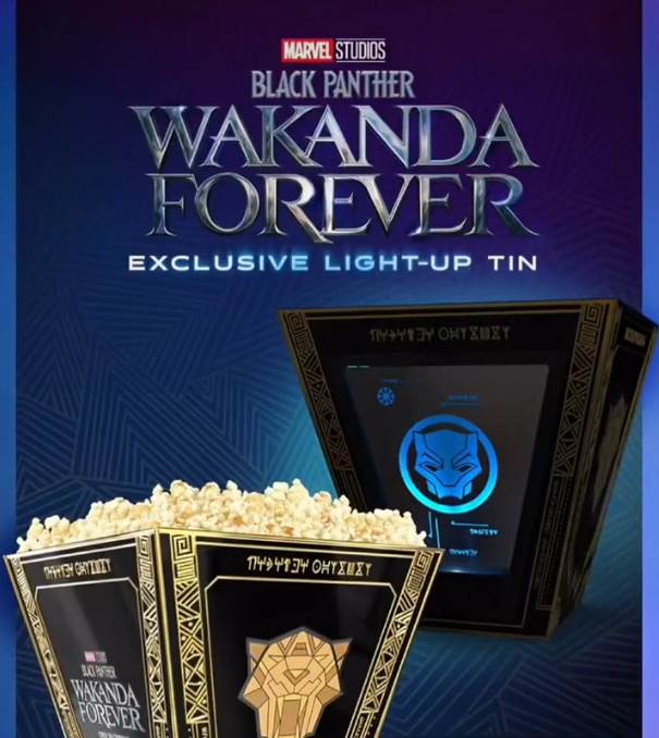 - A new Black Panther: Wakanda Forever exclusive light-up popcorn tin will be available at participating AMC Theatres beginning November 10.