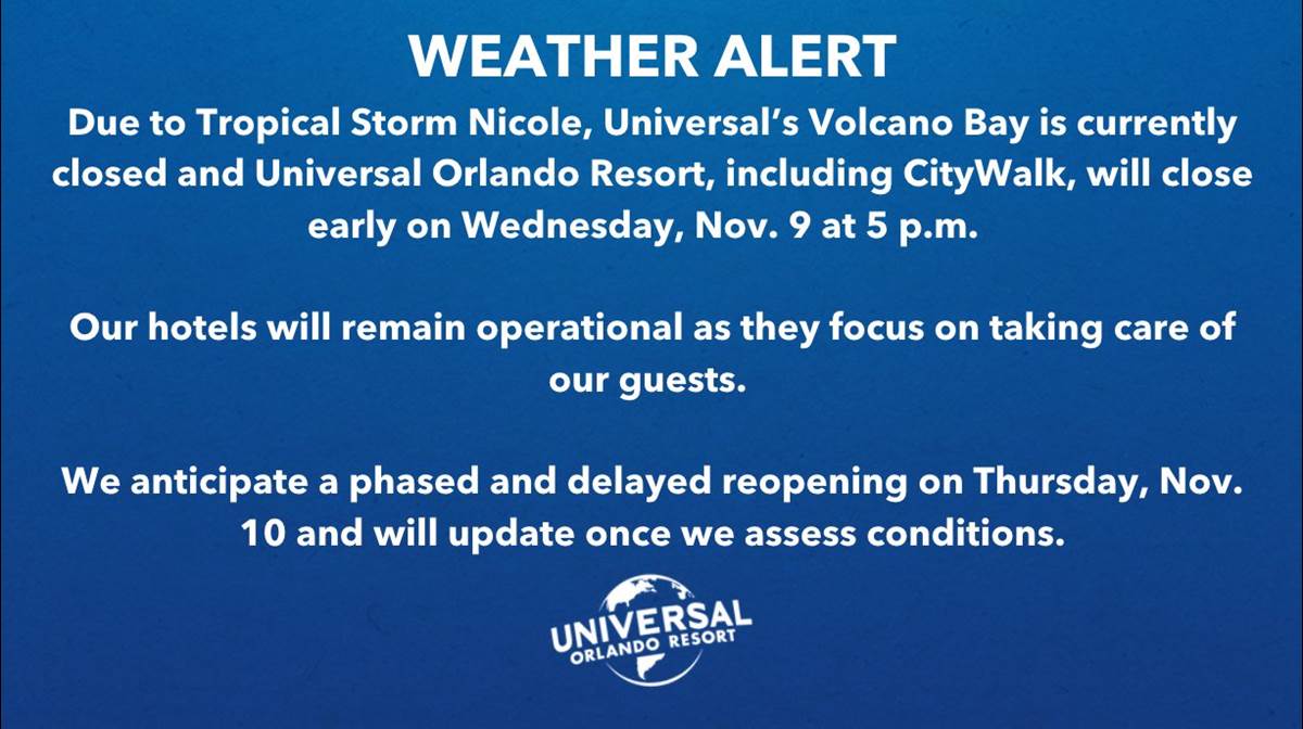 - Due to the expected arrival of Tropical Storm Nicole, Universal Orlando has announced that Universal Studios Florida, Islands of Adventure and CityWalk will have a phased closure today (November 9th) beginning at 5:00 p.m.