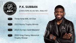 ESPN has signed three-time NHL All-Star and Norris Trophy winner P.K. Subban to a multi-year agreement. Subban will join ESPN’s industry-leading roster of dynamic NHL play-by-play announcers, analysts and reporters, making his season debut in the coming weeks as an in-studio NHL analyst.