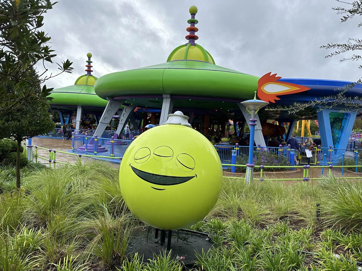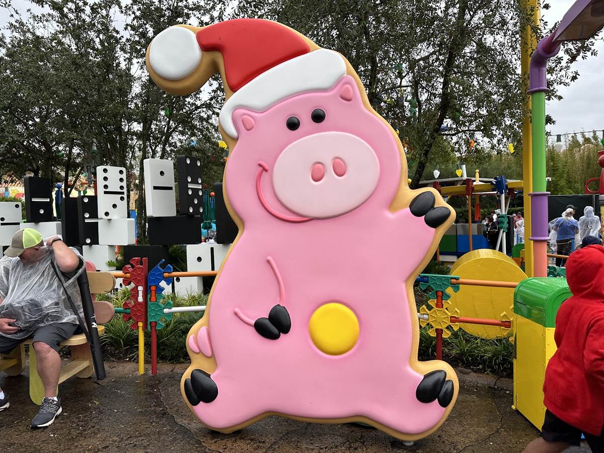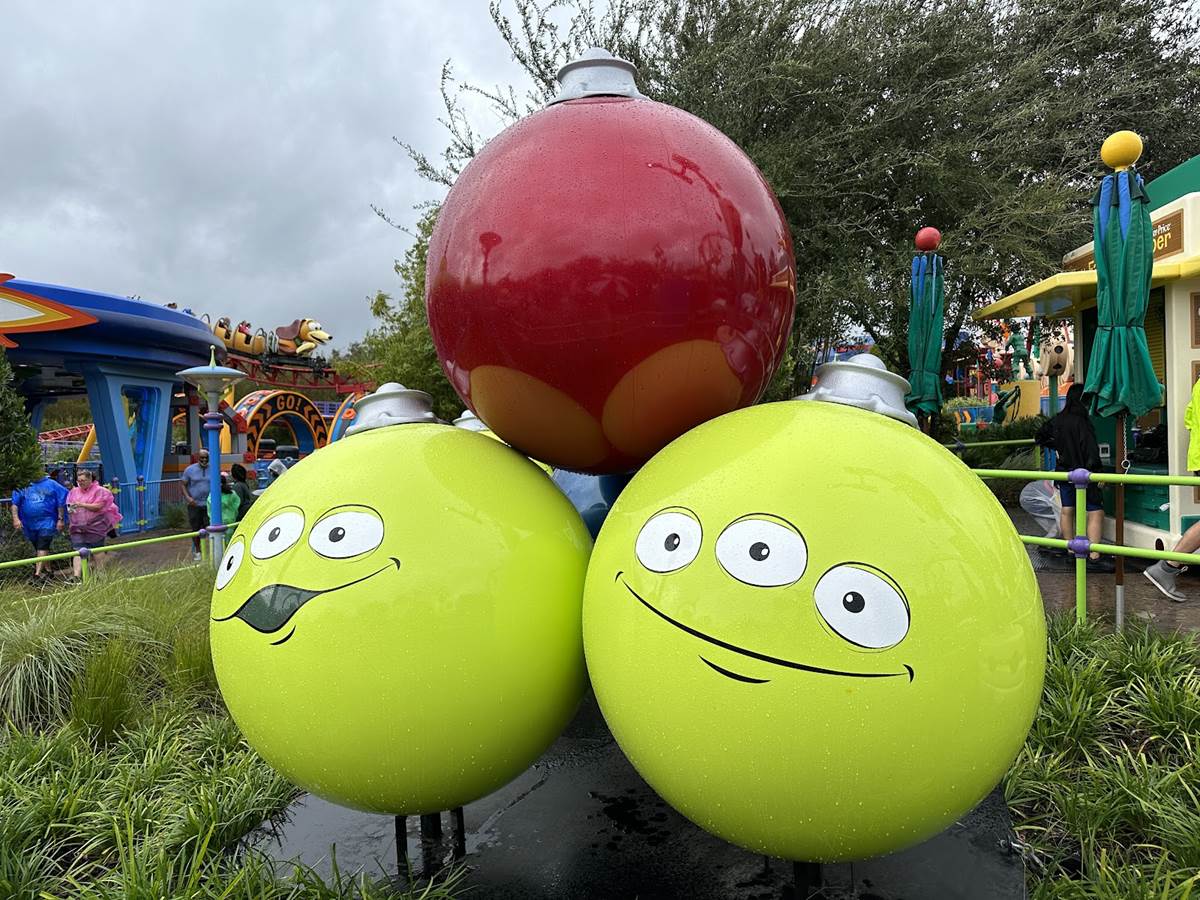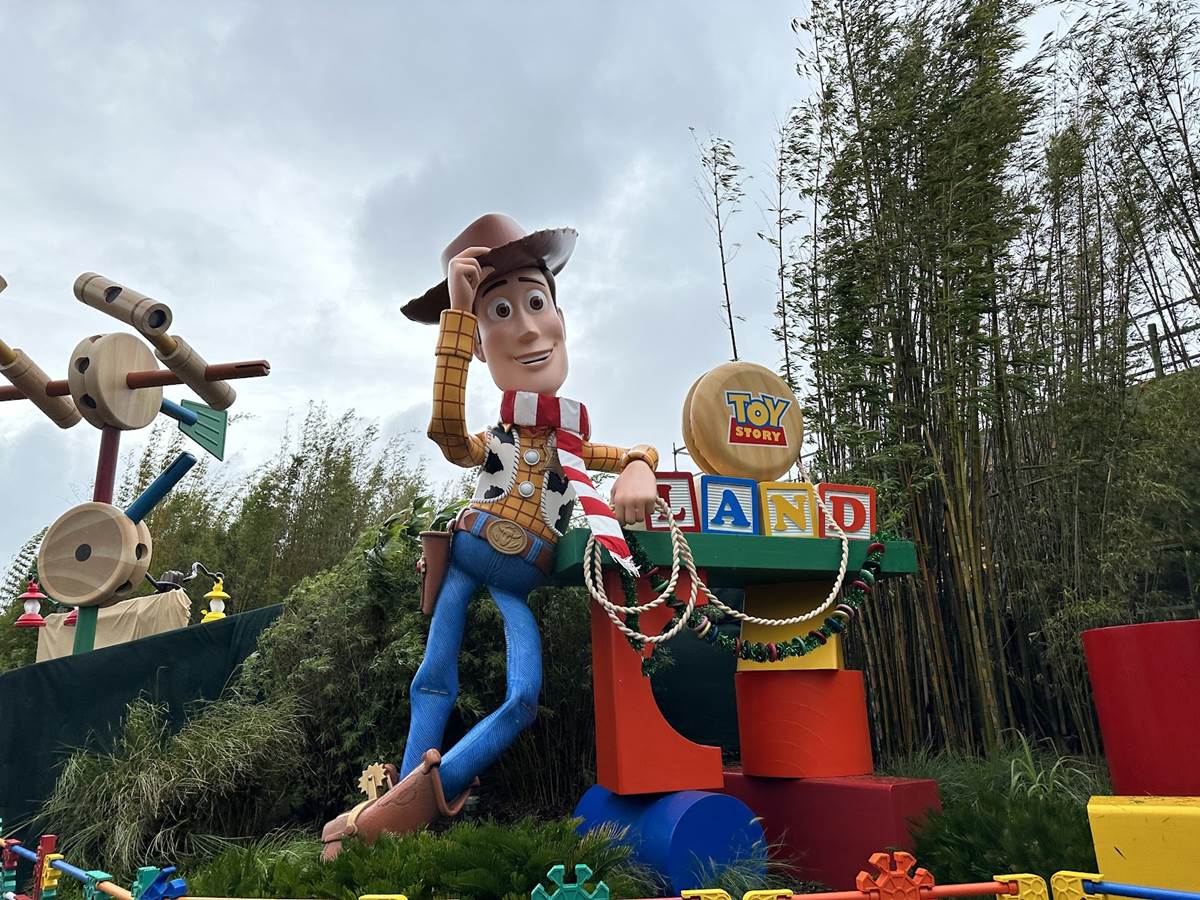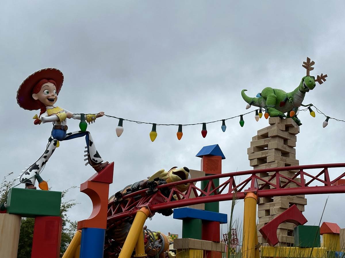 Over in Toy Story Land, more fun can be spotted with some familiar faces from the Toy Story franchise. The charming Little Green Men that are featured in Alien Swirling Saucers are also adorned upon some giant ornaments surrounding the attraction. Guests can also see Woody, Jessie, and Rex wearing some winter gear.