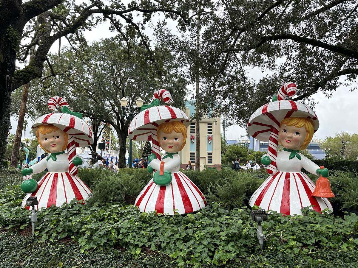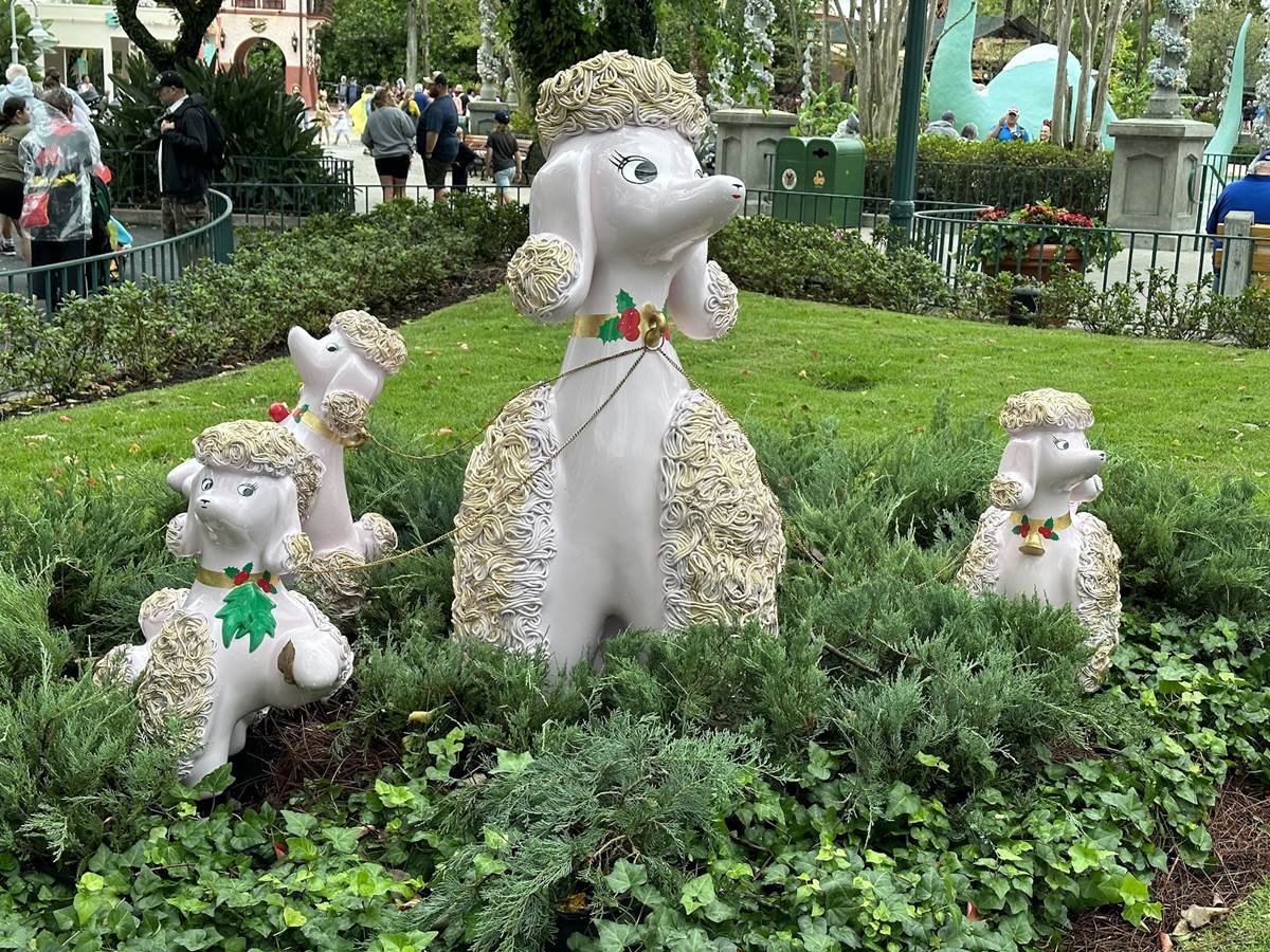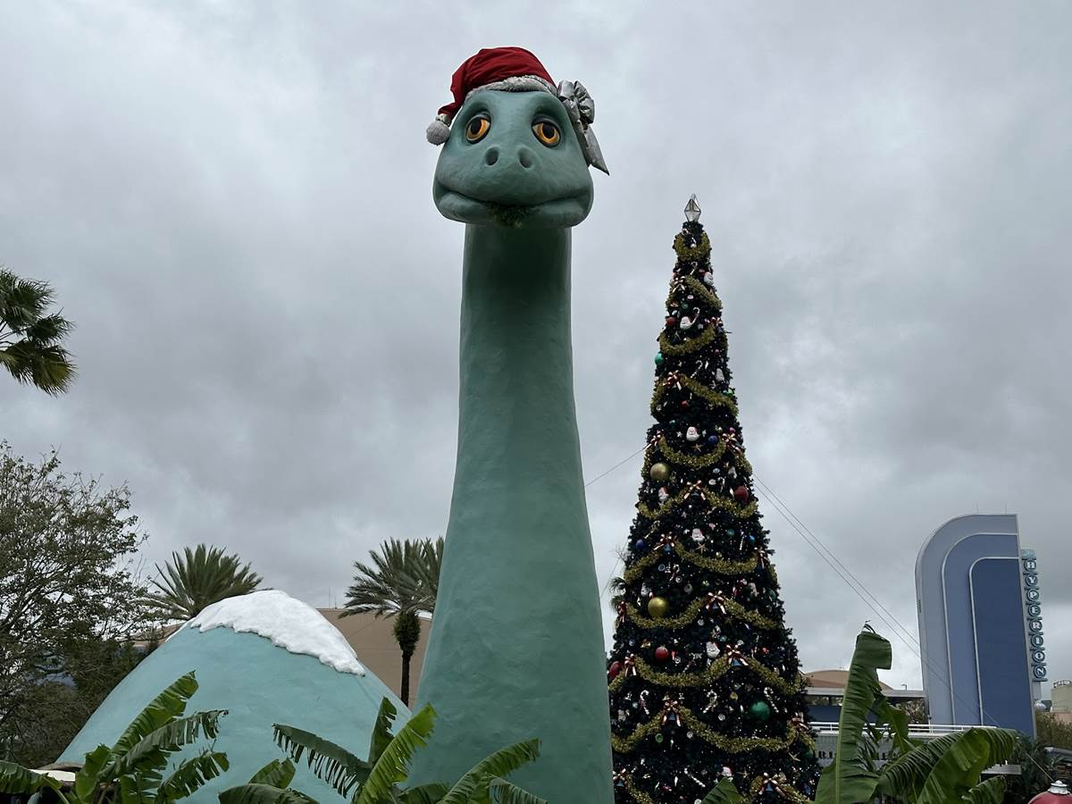 Echo Lake steals the show for holiday decorations at the park every year the past few years with a vintage vibe with statues and decorations that pepper the landscaping of the area. The lake itself also plays home to the park’s Christmas Tree, with the tree towering over the manmade body of water and giant ornaments floating nearby. Even Gertie the Dinosaur gets in on the fan with her very own Santa Hat.