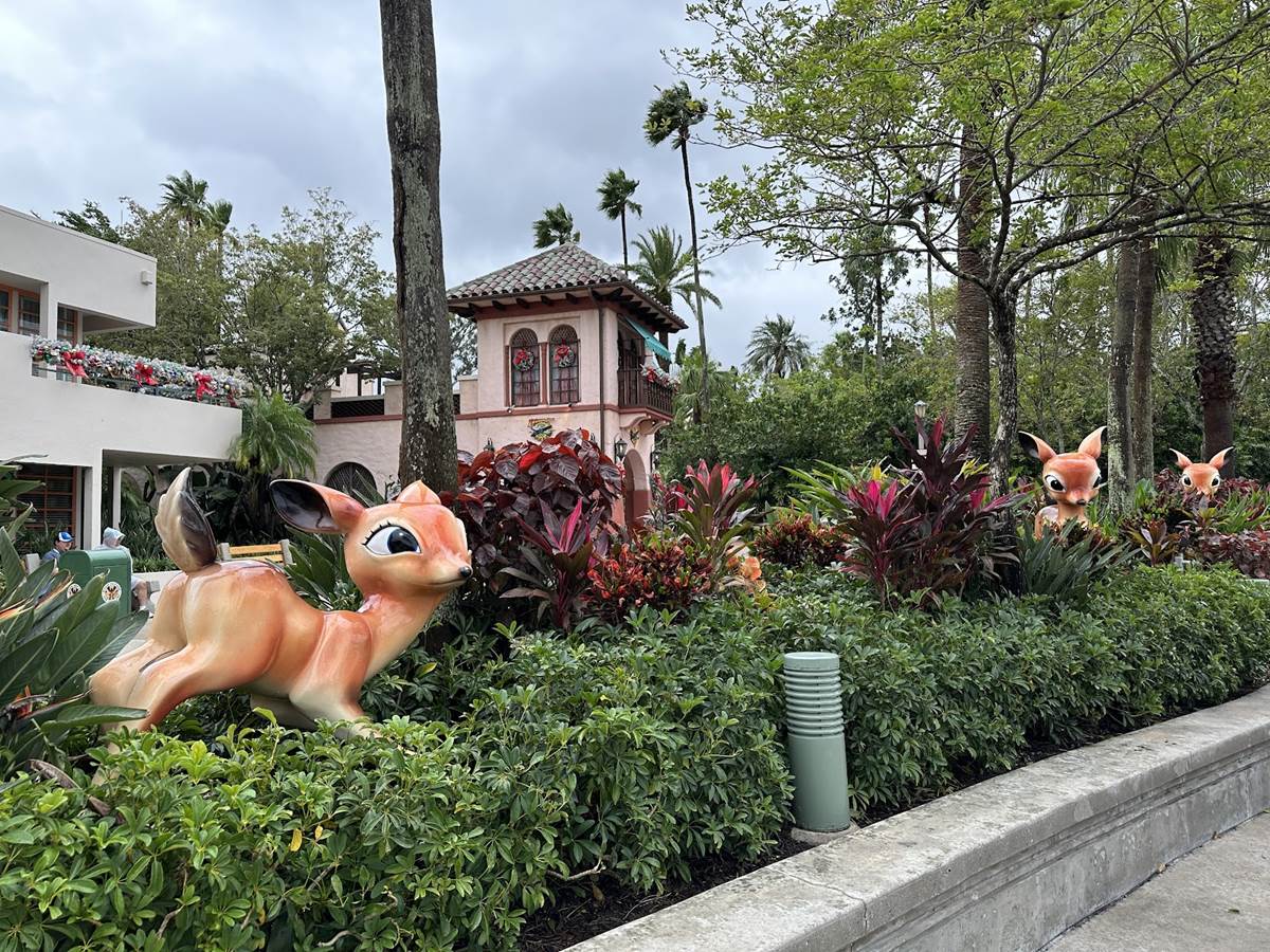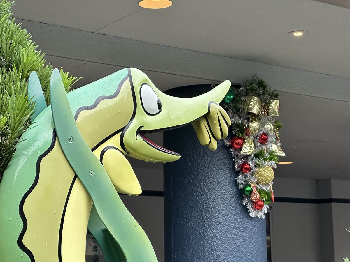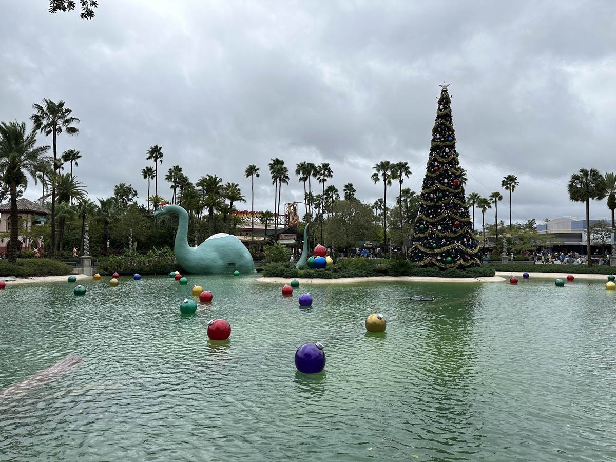 Echo Lake steals the show for holiday decorations at the park every year the past few years with a vintage vibe with statues and decorations that pepper the landscaping of the area. The lake itself also plays home to the park’s Christmas Tree, with the tree towering over the manmade body of water and giant ornaments floating nearby. Even Gertie the Dinosaur gets in on the fan with her very own Santa Hat.