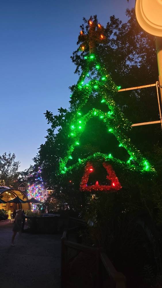 More festive fun can be found over in DinoLand U.S.A. where the Olden Gate Bridge is decked out as Santa Claus and covered in lights, making for quite the spectacle at night!