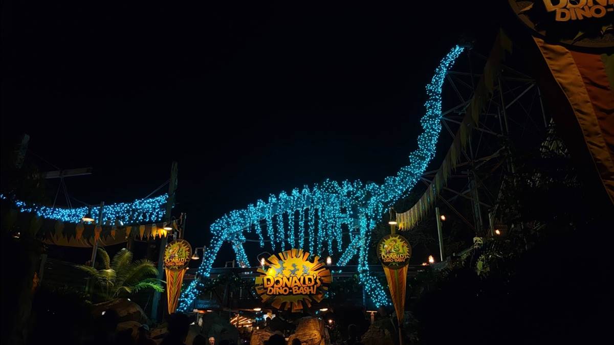 The lights go through a variety of different patterns, timed to the quirky Donald’s Dino Bash holiday music.
