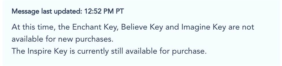 - This afternoon, an update in the Disneyland Resort’s digital queue for purchasing Magic Key Passes revealed that the Believe Key and Imagine Key were no longer available for new purchases.