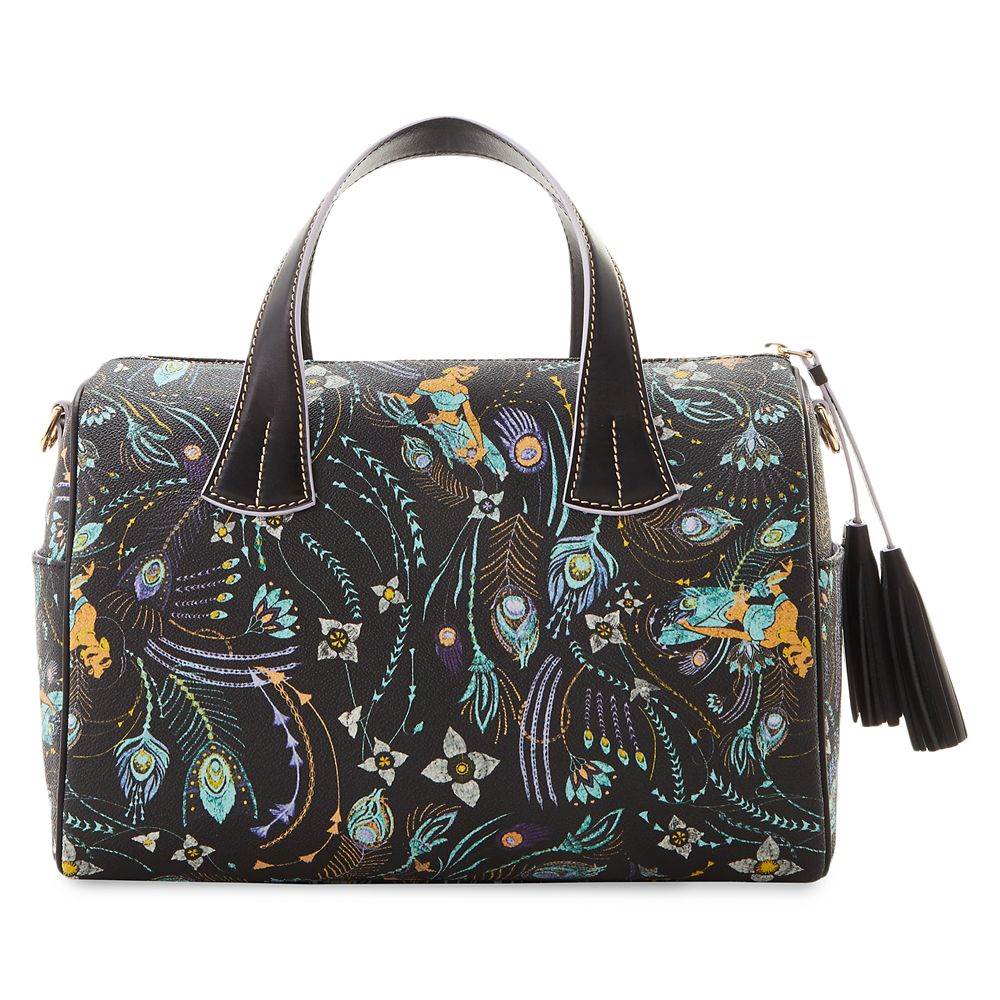 - As for the pattern itself, Jasmine’s full figure is featured sparsely, while colorful peacock feathers, flowers and ferns make up a majority of the look. It’s all set against a solid black background and the bags are finished with matching black piping.