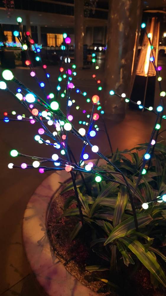 From the moment guests arrive, they can spot upside down Christmas trees in the light fixtures of the porte cochere as well as a garden of illuminated shrubs and flowers.