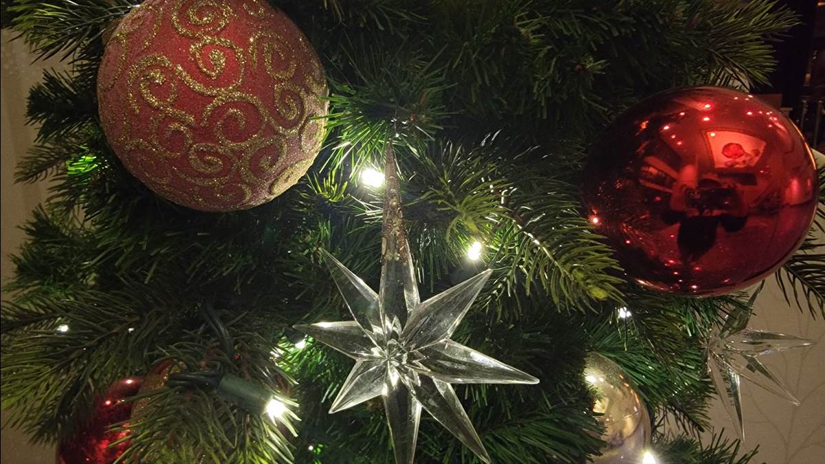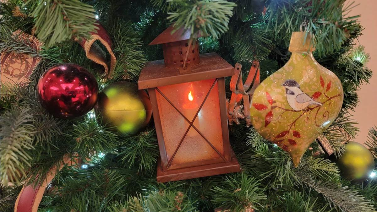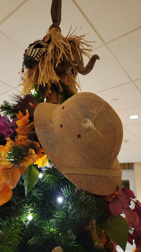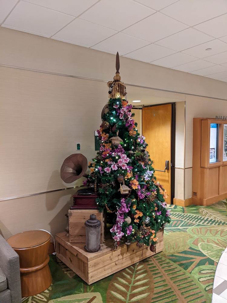 A similar tree can be found in the lobby of the Adventure Tower, though you won’t find Frontierland theming on the tree, you’ll find some Adventureland-esque decor. Ornaments look like tiki huts and drums, and a safari helmet sits upon the top of the tree.