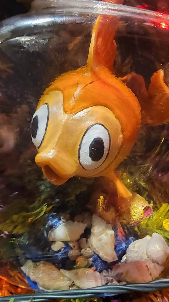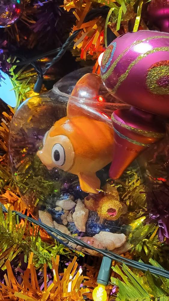 But trees in the hallway are filled with whimsy, including a tree that is bending from the weight of a large ornament, and another ornament that seems to pay homage to Cleo from the Walt Disney Animation Studios classic, Pinocchio.