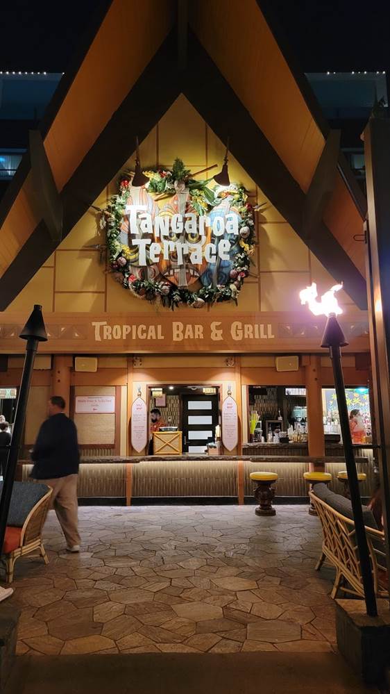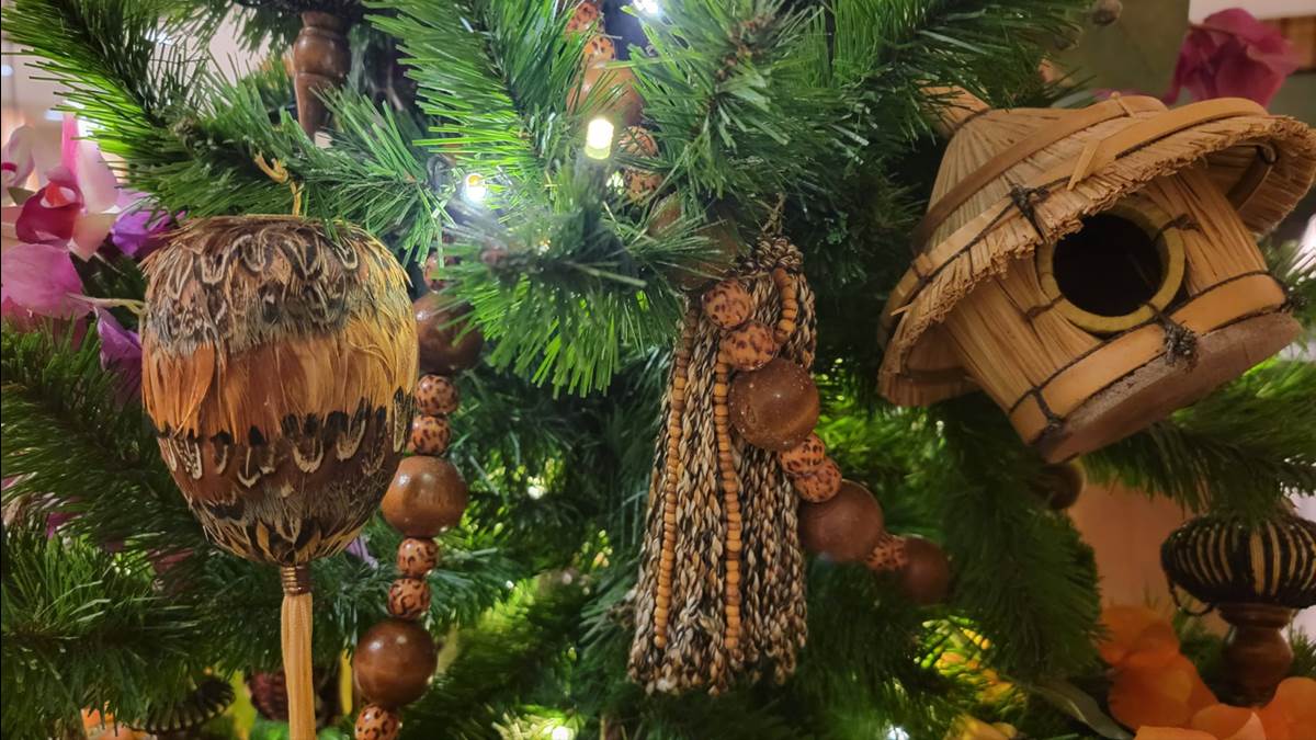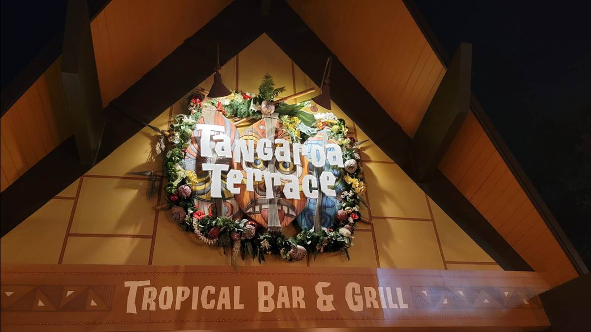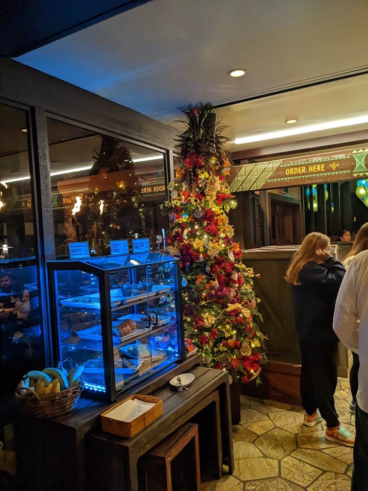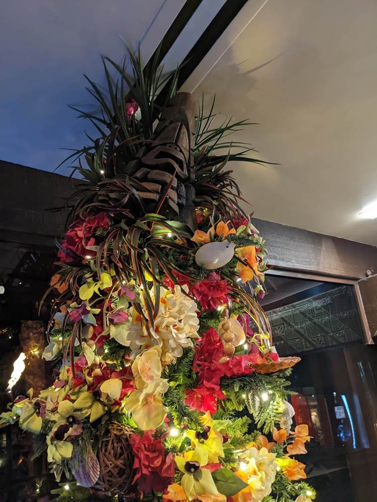 Over at Tangaroa Terrace, the marquee features garland, and inside, a festive tree full of floral designs and ornaments.