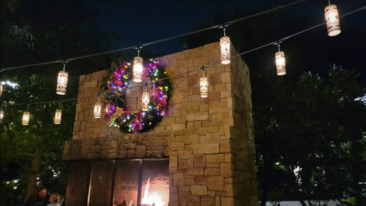 Outside, the outdoor patio seating area featuring a giant outdoor fireplace is also adorned with a wonderful wreath.