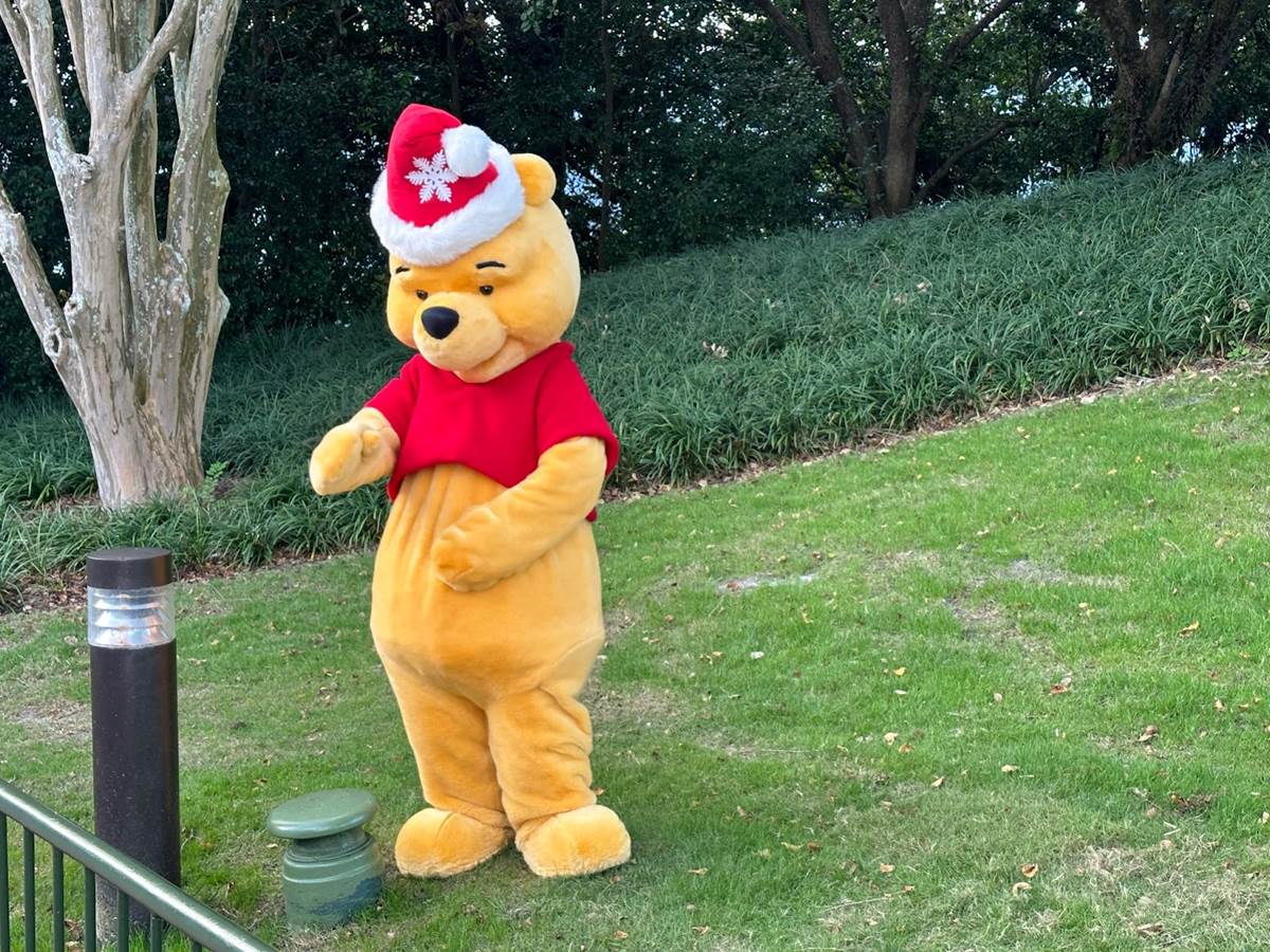 Winnie the Pooh is wearing a cute Santa hat for the holidays.