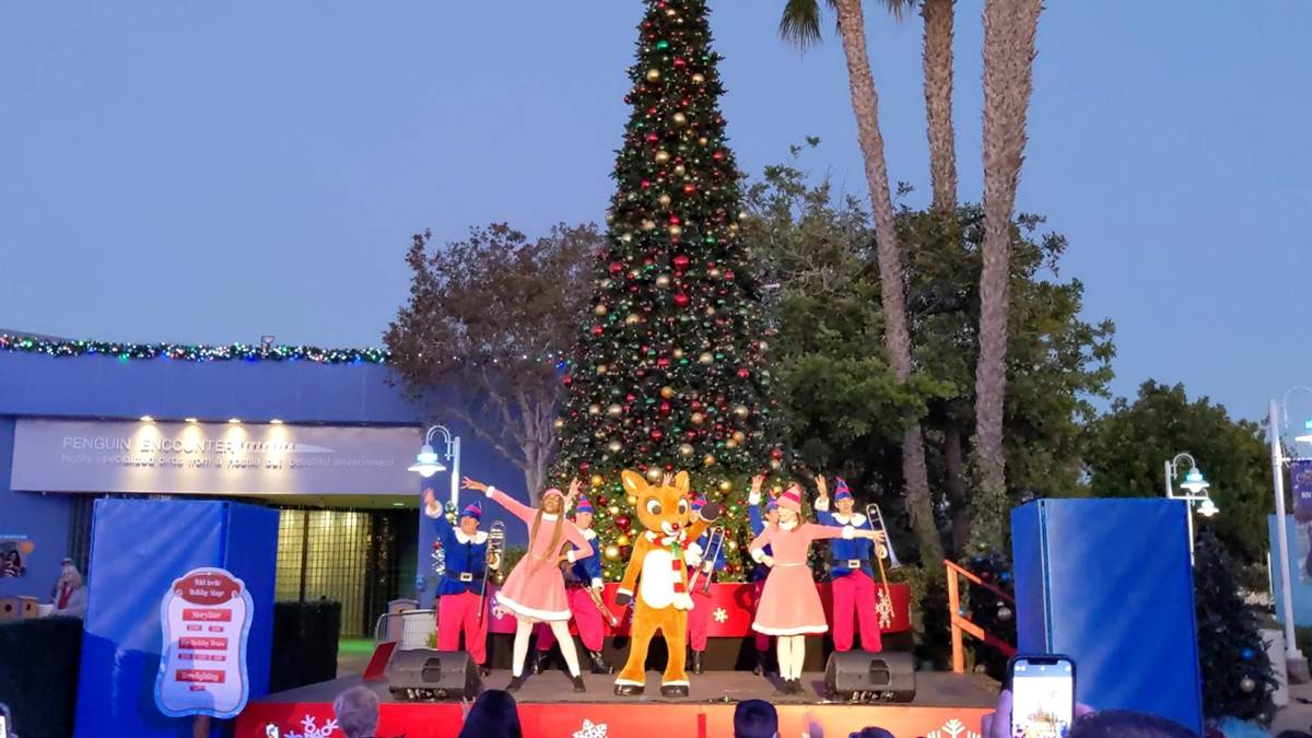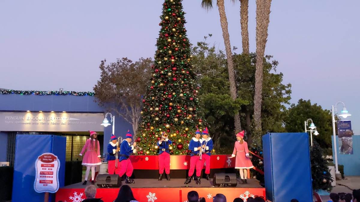 - Over by the Penguin Encounter, the Holiday Brass join Rudolph the Red-Nosed Reindeer to help light up the park’s Christmas tree every night.