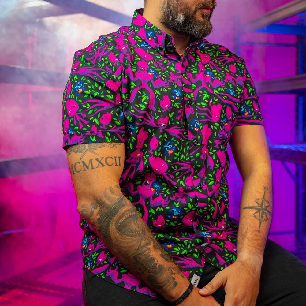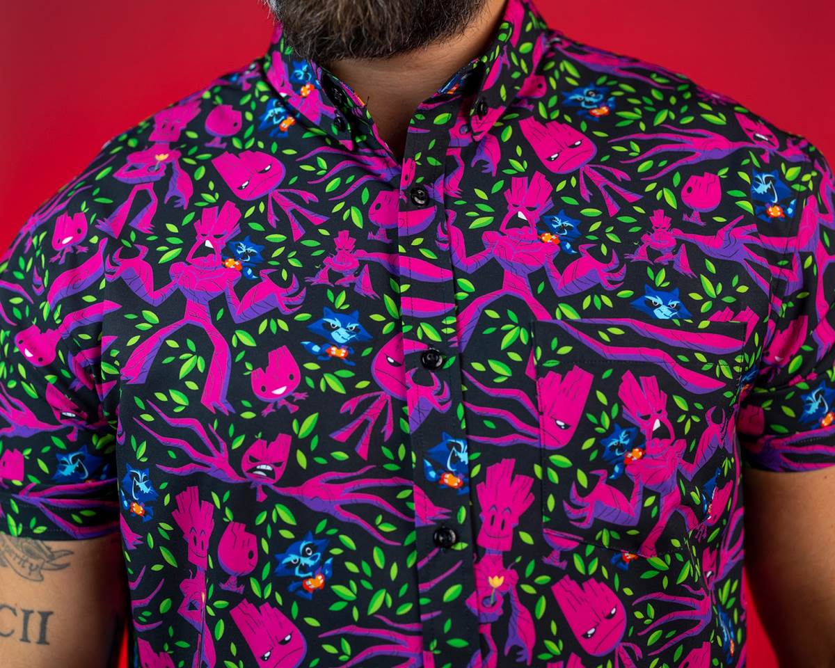 Magenta and neon green have never looked so good. Follow Groot’s growth from toddler to adult tree on this cleverly patterned shirt, and keep your eyes peeled for Rocket who's along for the journey.