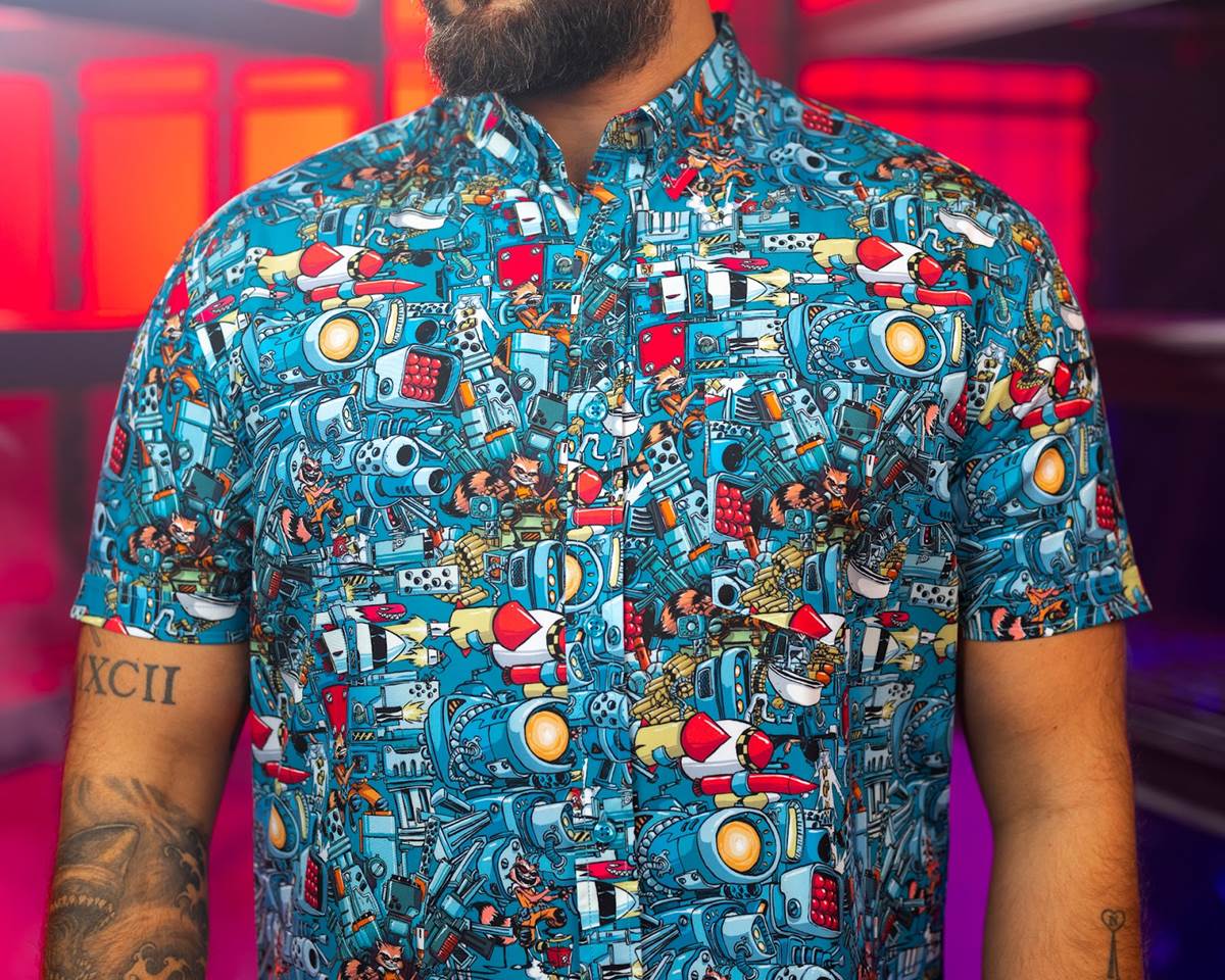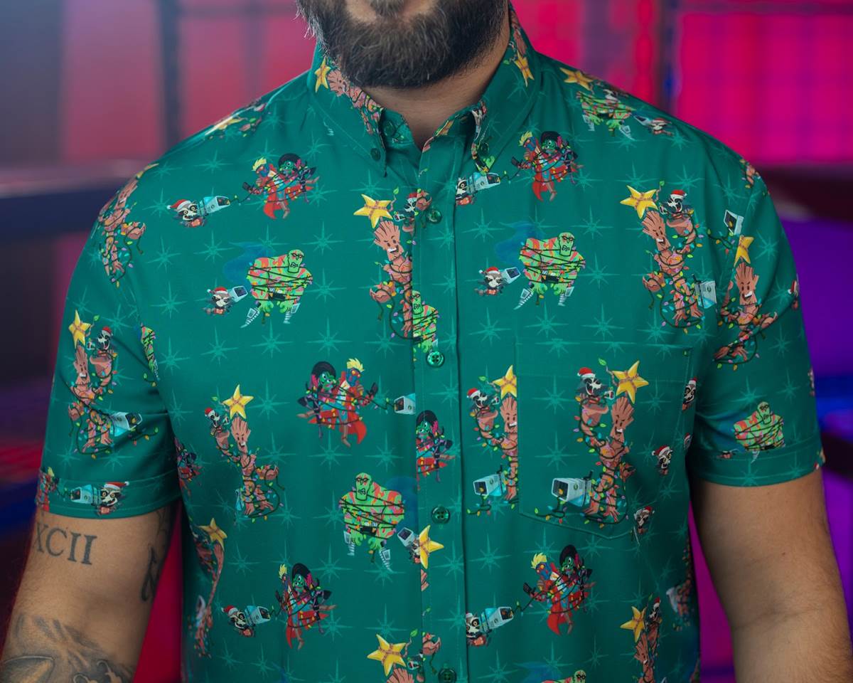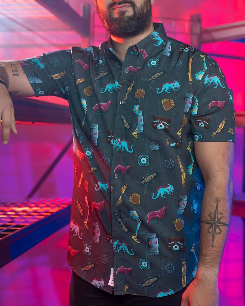 Merry Christmas and all the other winter holidays too! The Guardians are hanging out on this green button down and getting into all sorts of hijinks such as tangling themselves in colorful lights while they celebrate the season. Look closely and you’ll notice the “star" background is actually the Nova Corps Starblaster.