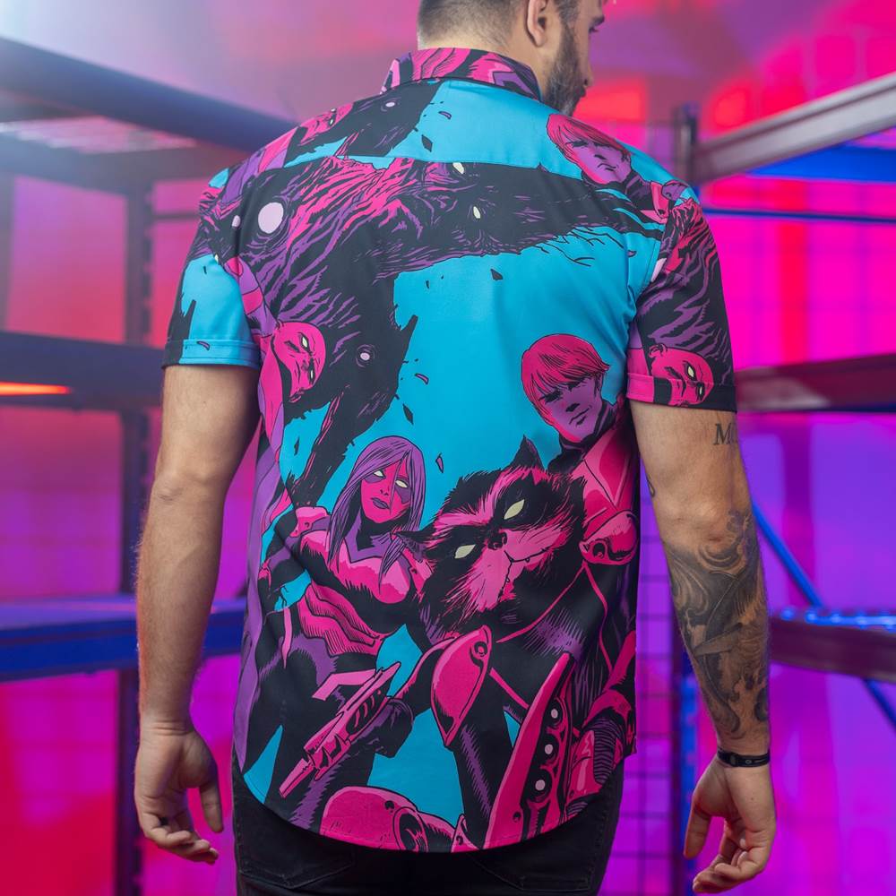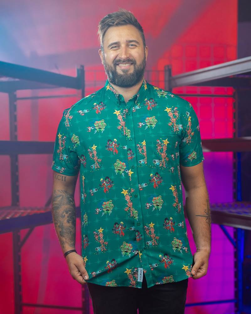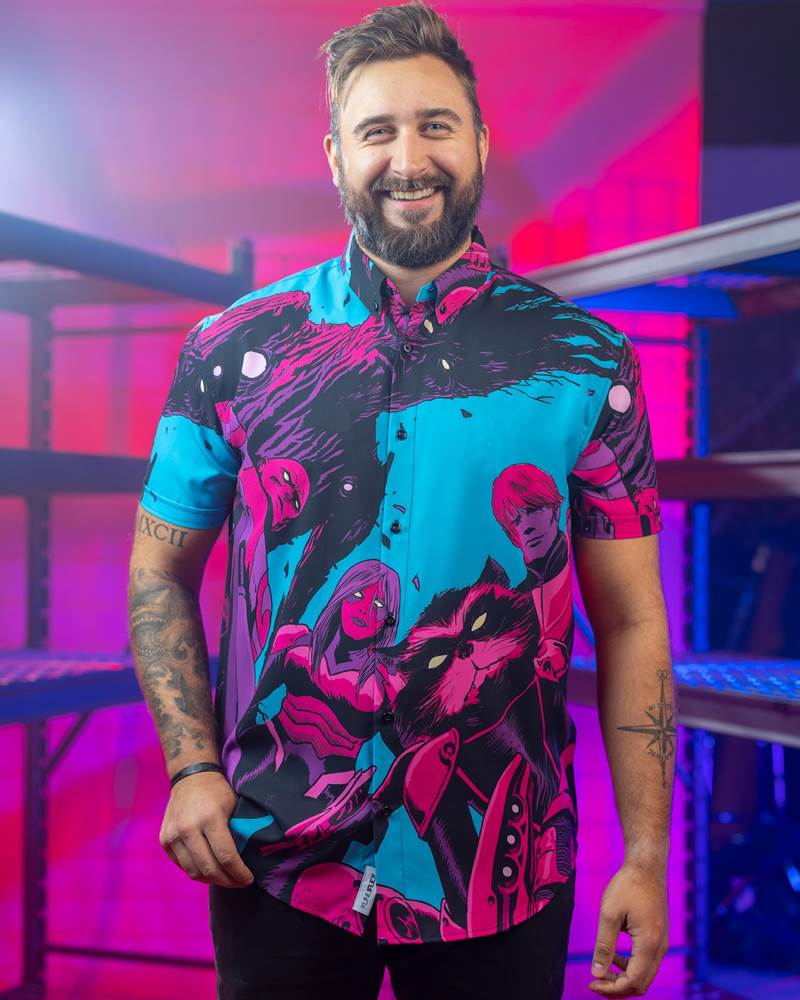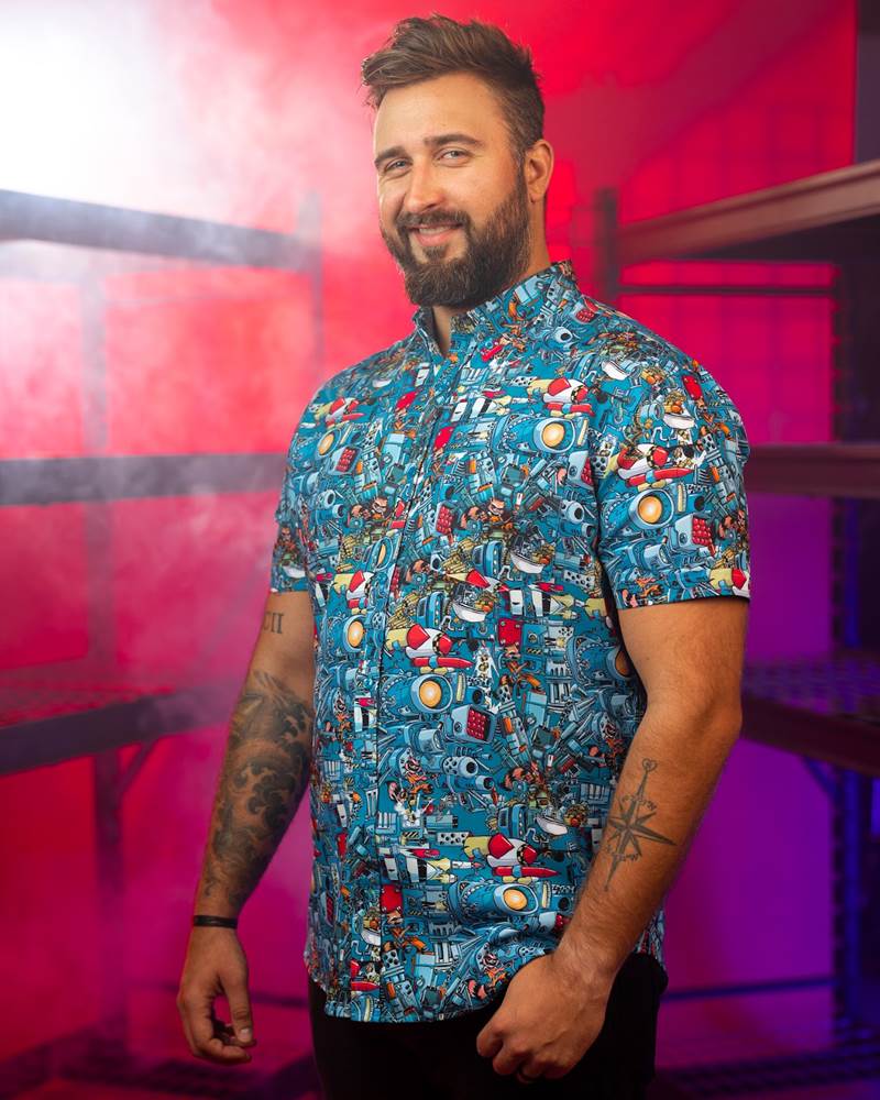 Merry Christmas and all the other winter holidays too! The Guardians are hanging out on this green button down and getting into all sorts of hijinks such as tangling themselves in colorful lights while they celebrate the season. Look closely and you’ll notice the “star" background is actually the Nova Corps Starblaster.