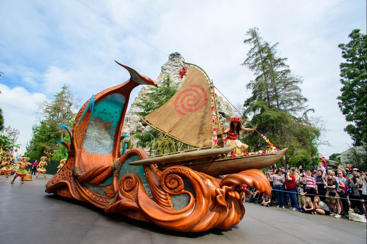 - Mickey & Friends joined Moana and Maui; Miguel and Pepita from Coco; Anna, Elsa, and Olaf from Frozen 2; Cinderella; Arthur and Merlin from The Sword in the Stone; Tiana from The Princess and the Frog; Aurora from Sleeping Beauty, and more partying pals as they made their way down the Disneyland parade route on fantastic floats accompanied by dozens of dazzling dancers.