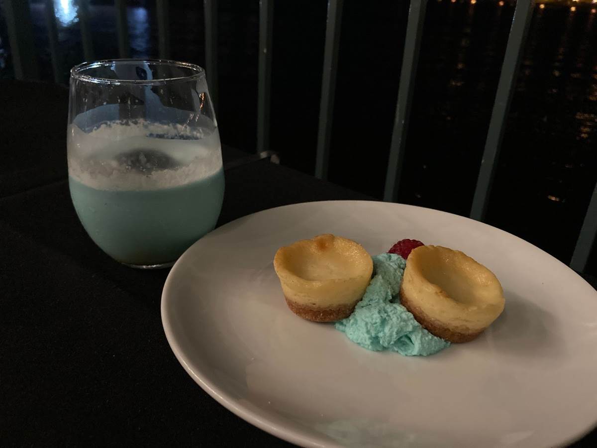 And that dessert was mini white chocolate cheesecake with a raspberry and some blue whipped cream. Not only did this plate look amazing, but it was a perfect dessert. The crust of these mini cheesecakes may have been the best bite of the night.