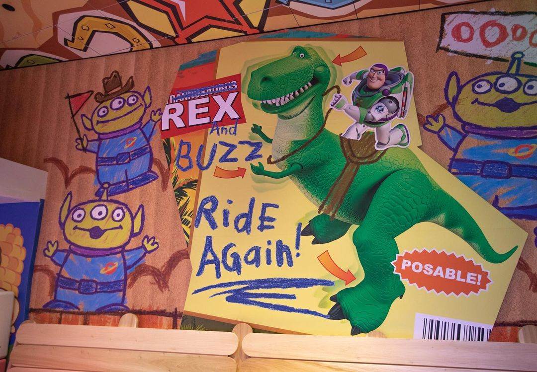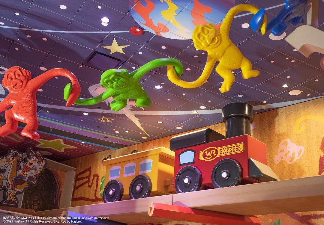 - The Disney Parks Blog shared even more details on the restaurant, including a steam train supported by colored pencils, a suspiciously impressive house of cards, and game boards featuring beloved characters from the Toy Story films.