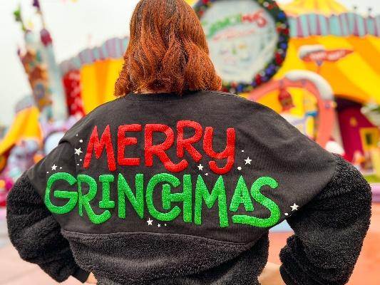 - Gear up for Grinchmas this holiday season with this half-fleece spirit jersey. The back features a shiny written “Merry Grinchmas," with the front bestowing a printed Grinch and sparkly reef.