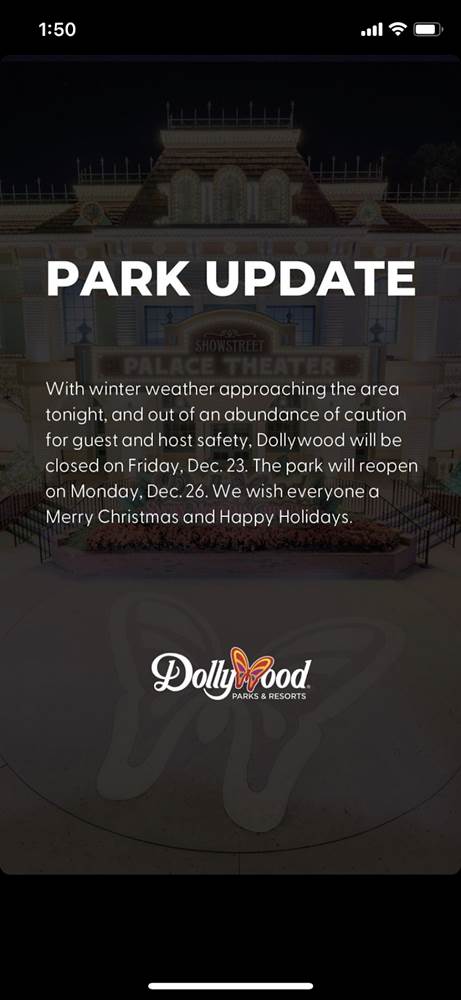 - The announcement, found on Dollywood’s official website and their social media accounts, reads: “With winter weather approaching the area tonight, and out of abundance of caution for guest and host safety, Dollywood will be closed on Friday, Dec. 23rd. The park will reopen on Monday, December 26th. We wish everyone a Merry Christmas and Happy Holidays."