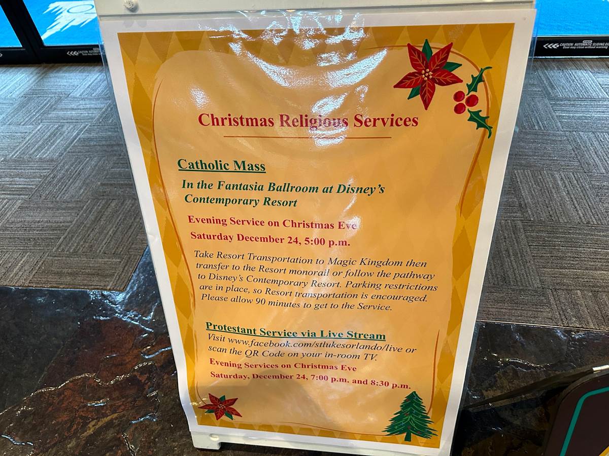 - The Fantasia Ballroom at Disney’s Contemporary Resort will host Catholic Mass on Christmas Eve, December 24th at 5:00 p.m.