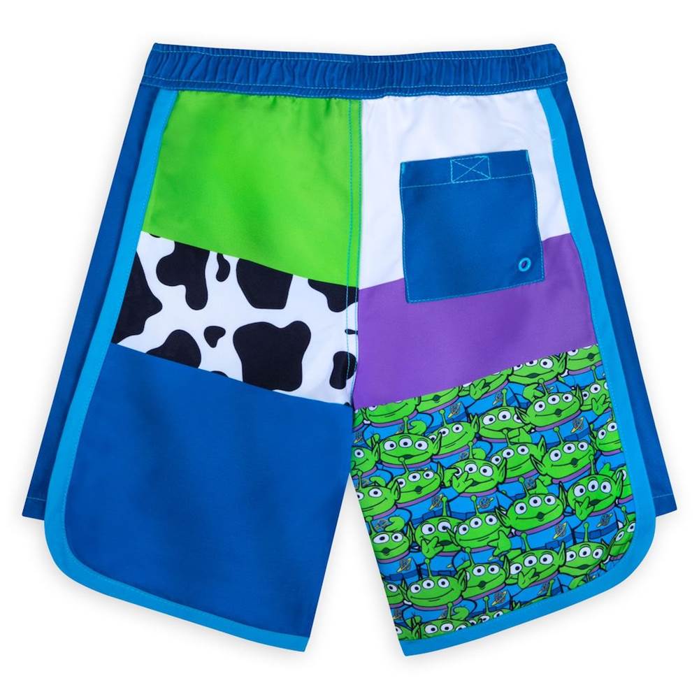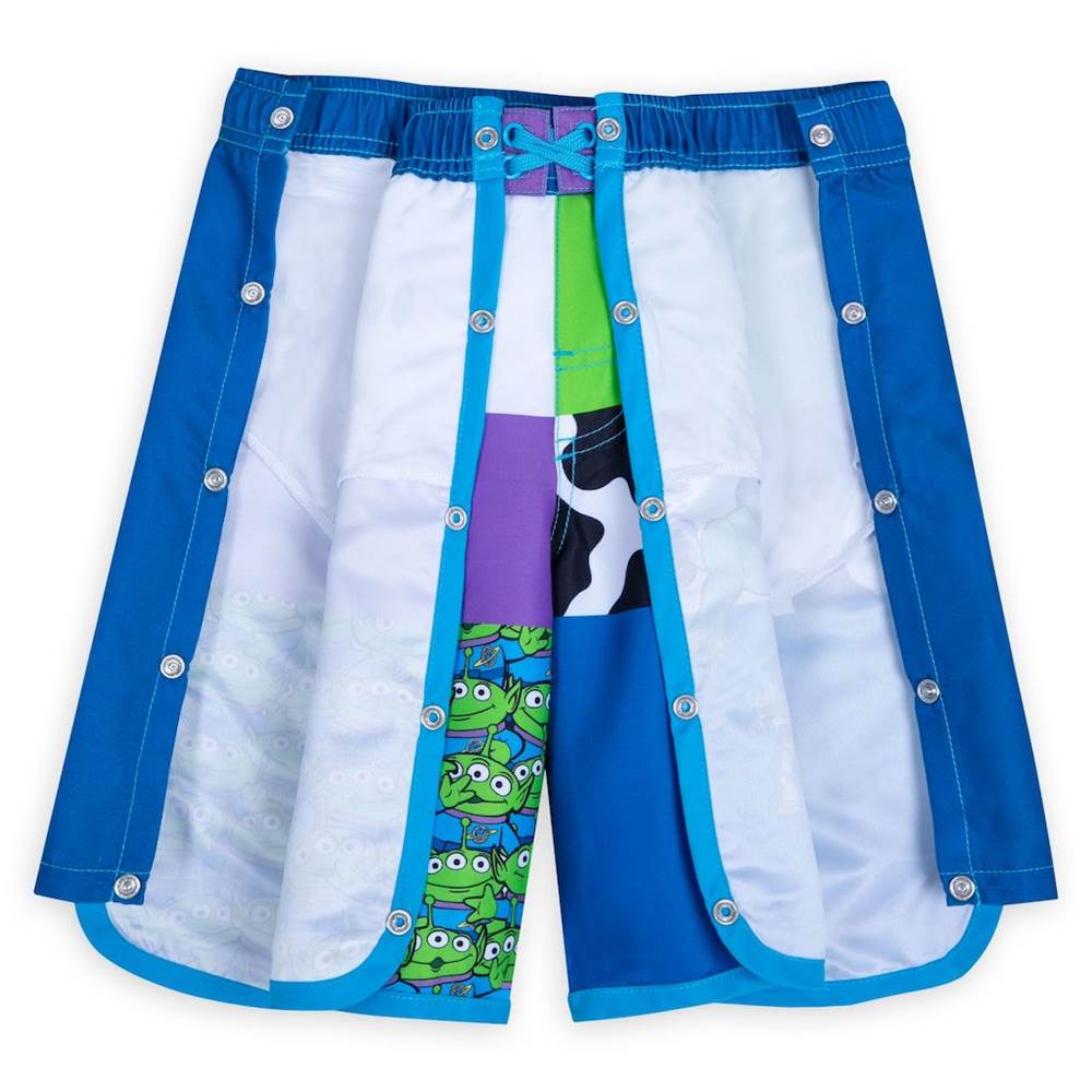 Woody, Buzz Lightyear and Rex round up the fun and a whole lot of Space Aliens on theseToy Story adaptive swim trunks. These adorable shorts feature screen art of the heroes, an allover print featuring motifs inspired by Disney and Pixar's Toy Story and a screen-printed faux fly on the front.