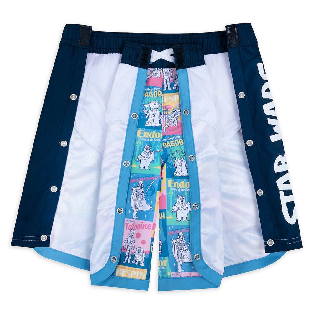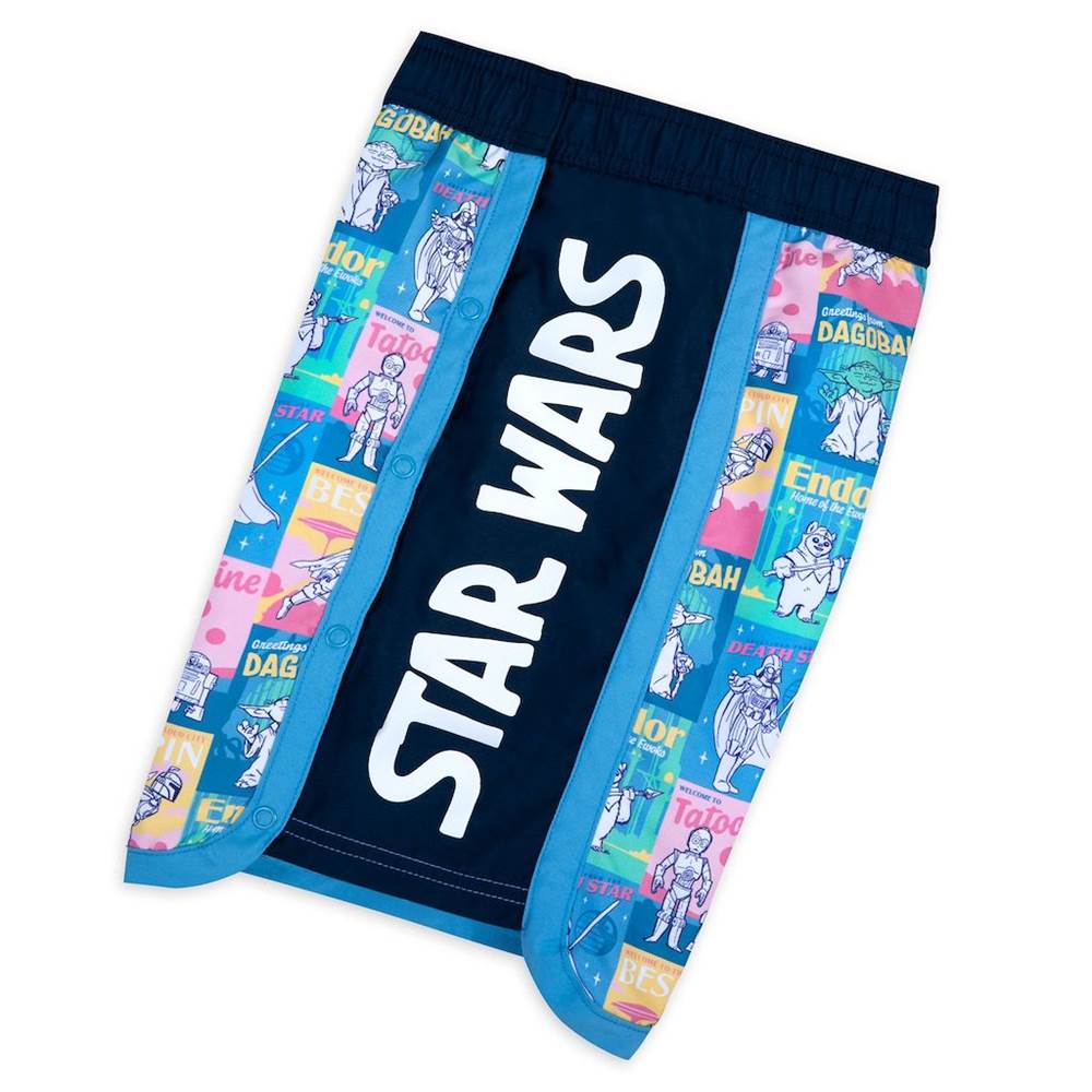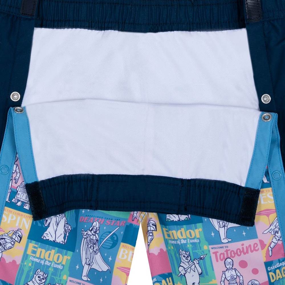 Greetings from Dagobah! These Star Wars adaptive swim trunks feature an allover print of fanciful travel stickers from some top spots in the galaxy including Endor, Tatooine and even the Death Star. R2-D2, C-3PO, Yoda, the Mandalorian, Greedo, Darth Vader and an Ewok star in the vintage-style art complete with fun slogans.