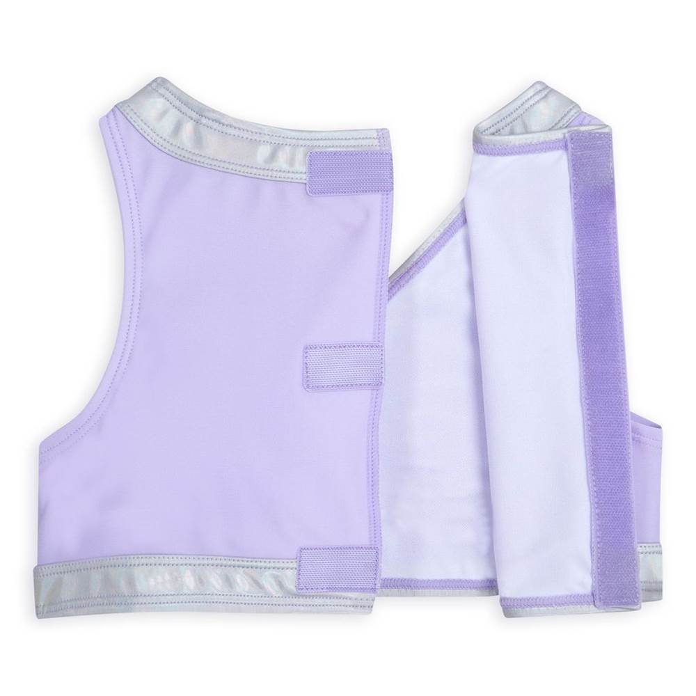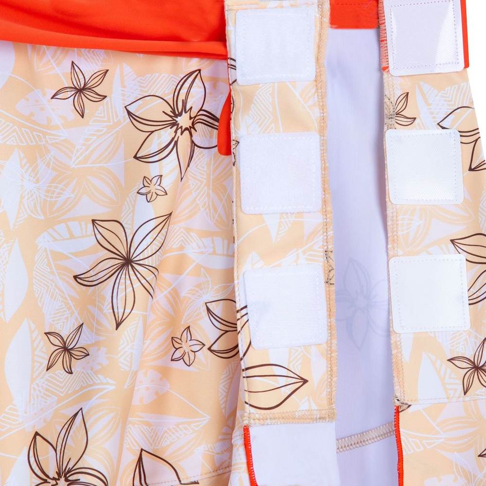 The water calls their name with this Moana adaptive swim set. Inspired by Disney's Moana, it includes a two-piece swimsuit and adorable tiered skirt cover-up, each featuring a pretty allover print and self-stick fabric closures for ease of use. The top has a ruffly hem and a very special soft 3D Heart of Te Fiti appliqué.