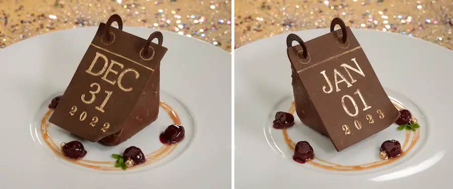 - Clock Strikes 12: Chocolate hazelnut mousse with orange sauce and champagne foam (New) (Available Dec. 31 only)