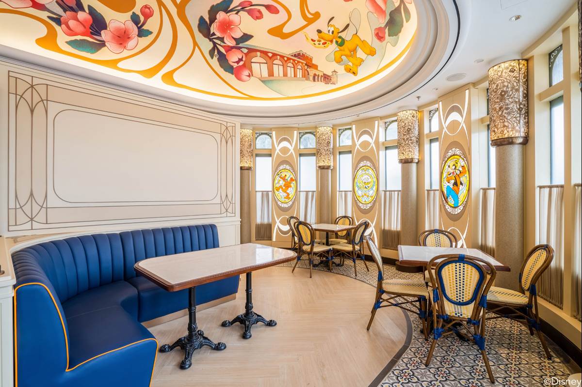 - Donald, Mickey, Minnie, Goofy, Pluto, Daisy, Chip & Dale and Donald’s nephews Huey, Dewey and Louie are depicted throughout the bistro, from the ceiling murals to the oval framed stained glass artworks on the walls, offering guests the ideal photo opportunity.