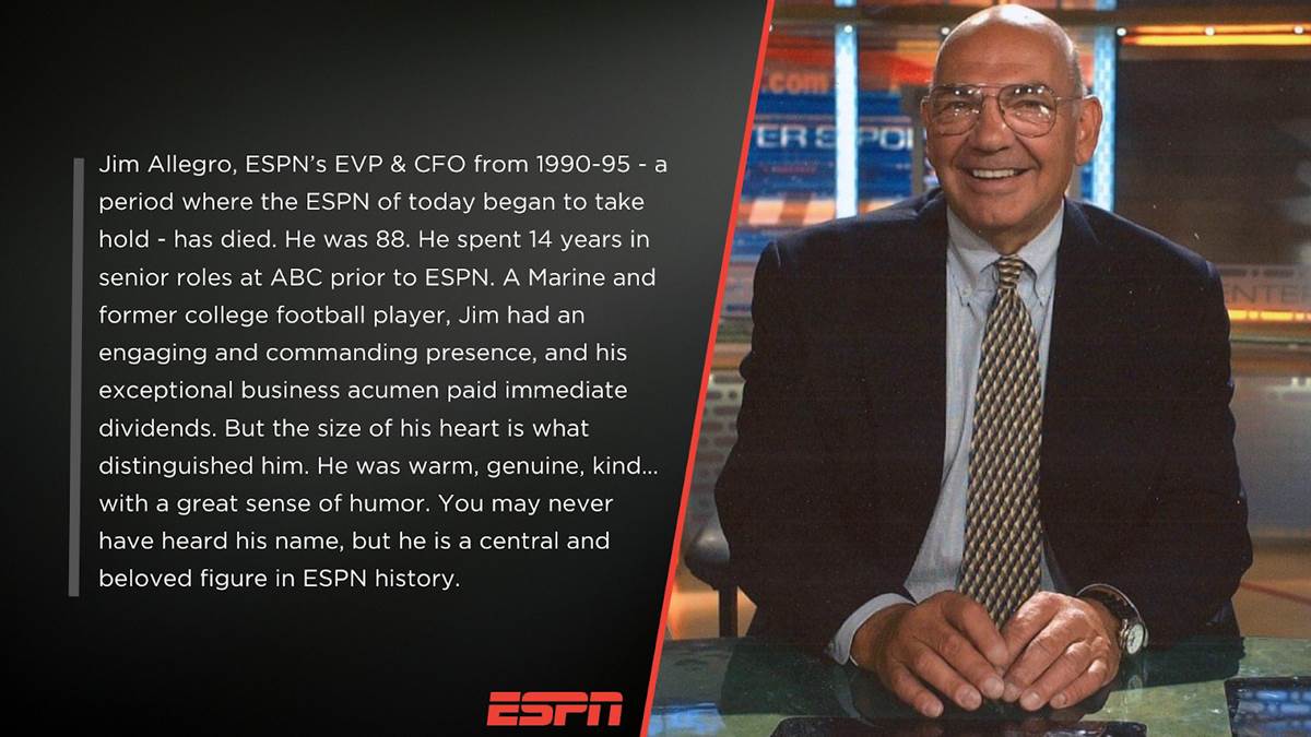 - Jim Allegro, ESPN's Executive Vice President of Operations and Chief Financial and Administrative Officer from 1990-95 – a period where the ESPN of today began to take hold – has died at the age of 88.