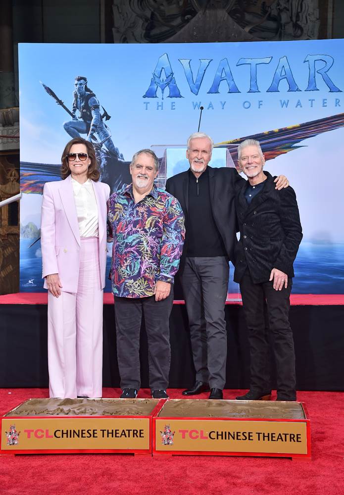 - Among the attendees at the ceremony, in which Cameron and Landau put their handprints and footprints in cement in the legendary movie palace’s forecourt, were Avatar: The Way of Water cast members Sigourney Weaver and Stephen Lang.