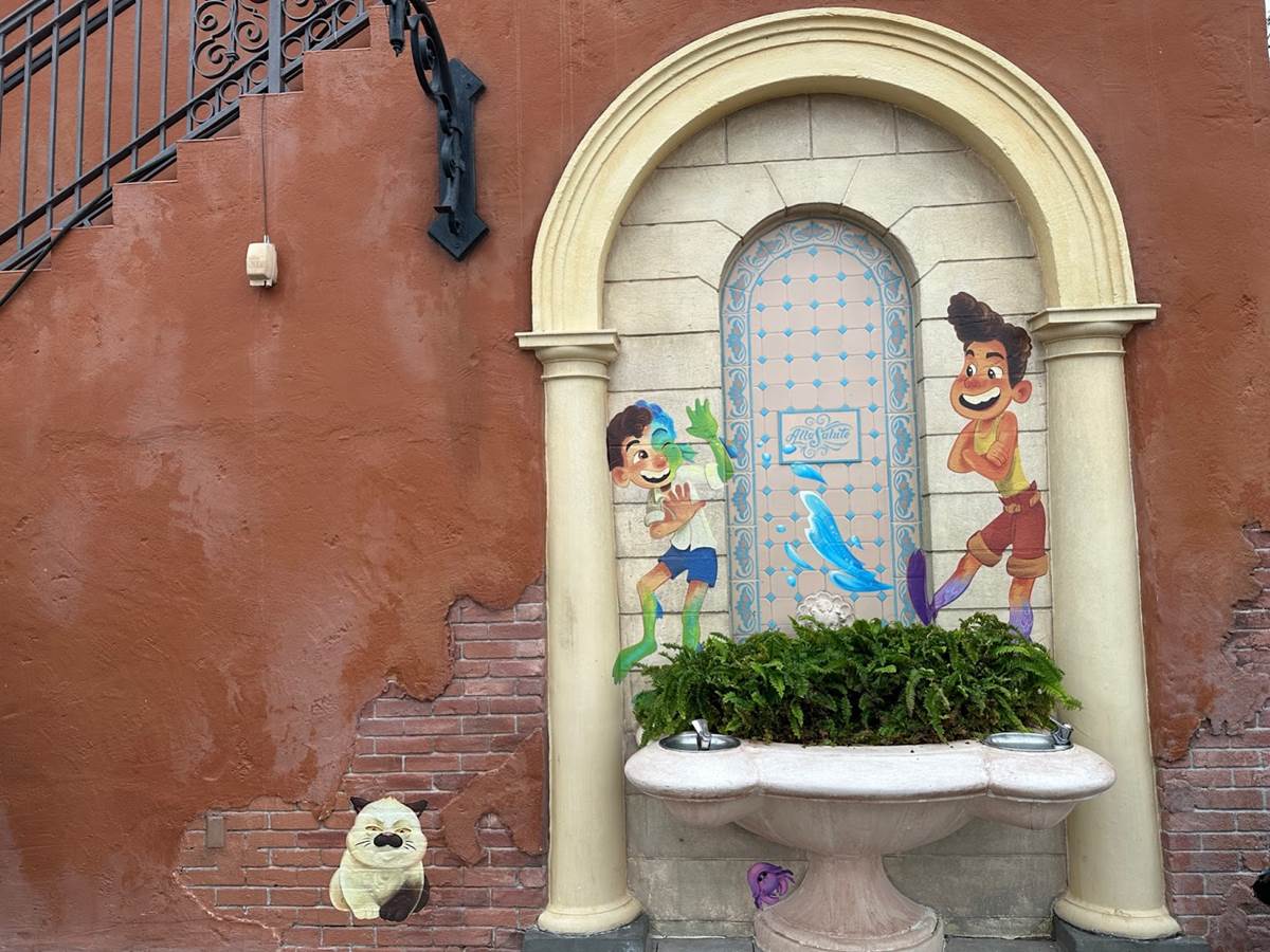 Friends Luca and Alberto from Pixar’s Luca are masterfully worked into this faux fountain in Italy.
