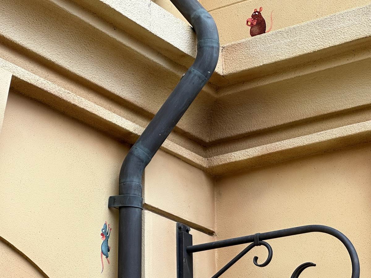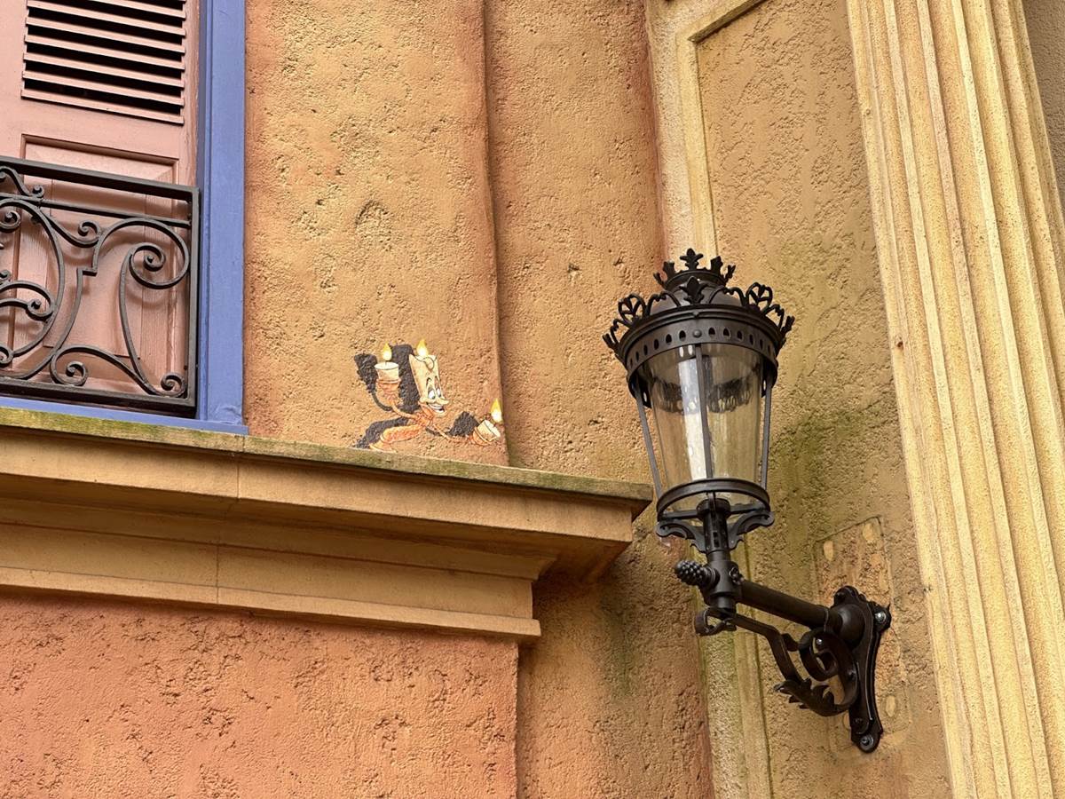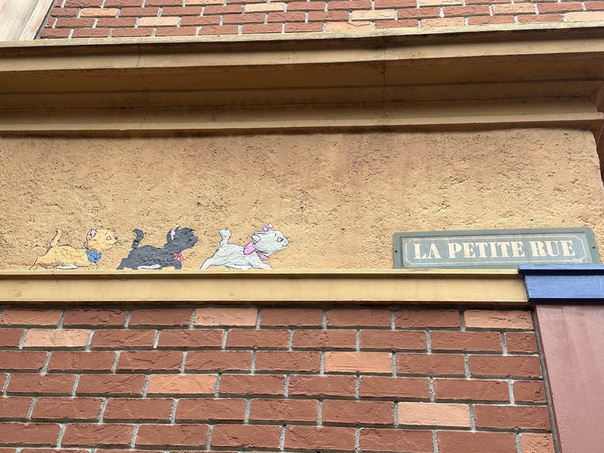The France pavilion features Duchess’s three kittens from the 1970 classic, The Aristocats. Berlioz, Toulouse, and Marie can be seen on the edge of a building near La Petite Rue.