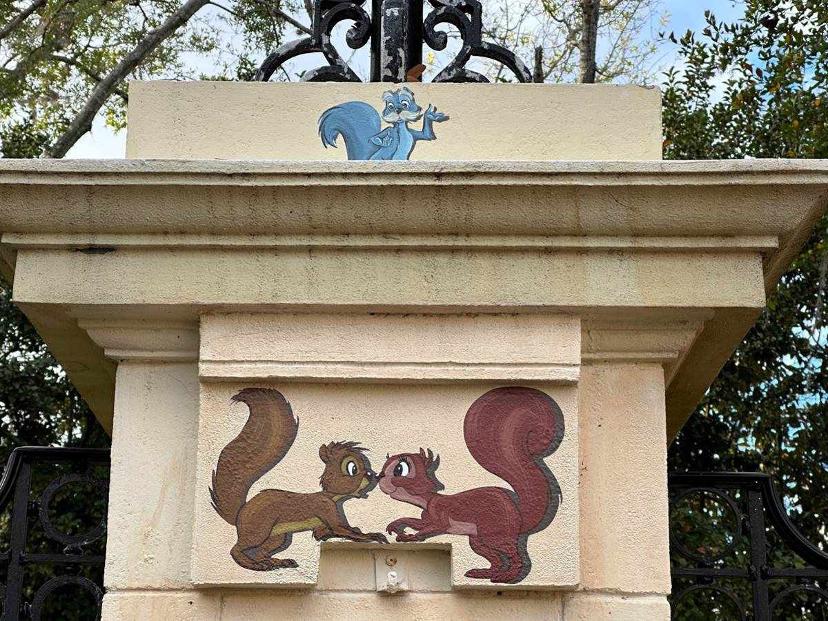 Across the hypothetical Thames river (that in this instance, leads to Crescent Lake) at the UK Pavilion, we come across another new installation of chalk art. Merlin and Arthur from The Sword in the Stone are transformed into squirrels, and even have a female squirrel admirer!