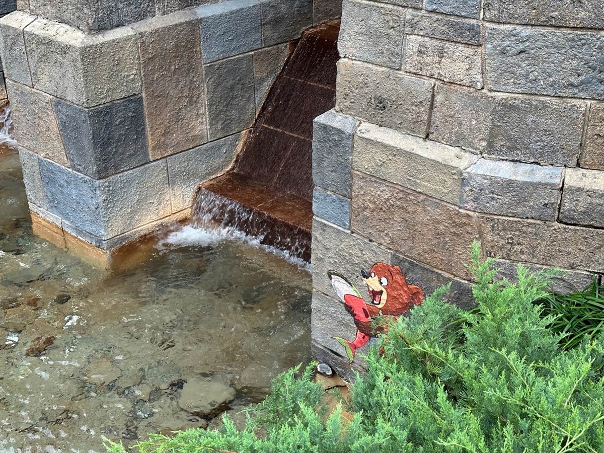 Further down the promenade, we can find Koda the bear from 2004’s Brother Bear catching some salmon under the bridge of the Canada pavilion, though his older counterpart Kenai is nowhere to be found.