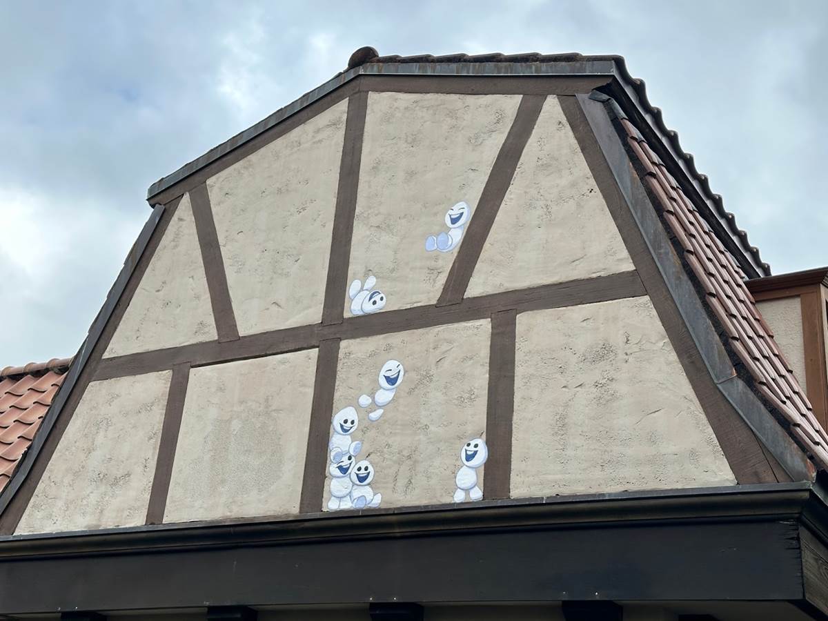 Snowgies from the animated short Frozen Fever can be found adorning the sides of the buildings of the Norway pavilion near the Somerhaus meet and greet area for Anna and Elsa.
