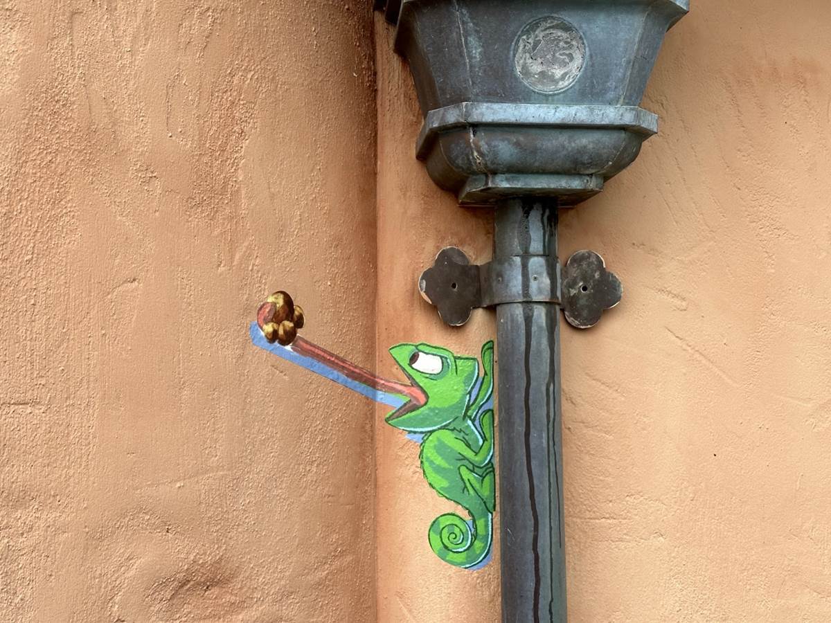 Do you think you missed something in Germany’s photo below? So did we at first. But there, camouflaged as best he can, you’ll find Pascal the chameleon from 2010’s Tangled. Need a little help? Look toward the word “Clocks."