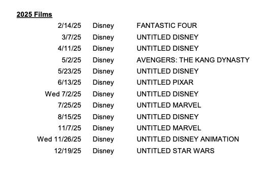 - Twitter user @TheEricGoldman shared Disney’s updated release calendar, which includes 21 new, currently untitled movies.