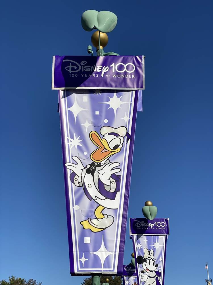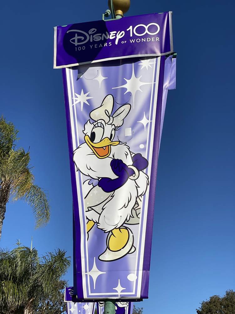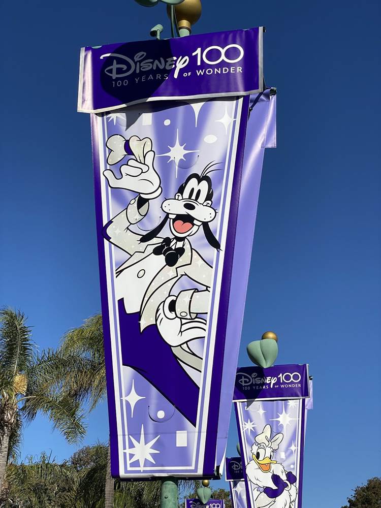 Right now, the festive purples and platinum have taken over the central Esplanade connecting both Disneyland Park and Disney California Adventure, with the popular banners showcasing the different experiences and attractions of each park switched out to the new celebration banners that feature Mickey Mouse, Minnie Mouse, Donald Duck, Daisy Duck, Goofy, Pluto, Chip, and Dale all in their celebration finest.