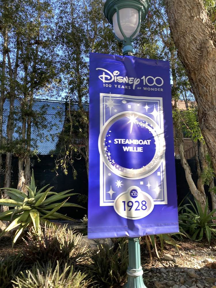 As guests approach aboard the famous parking garage tram, they are greeted with banners marking different milestones for the Walt Disney Company in the last hundred years, followed by the year of debut. For example, we have the first Mickey Mouse cartoon short released, Steamboat Willie, with the banner sporting 1928, the year it debuted.