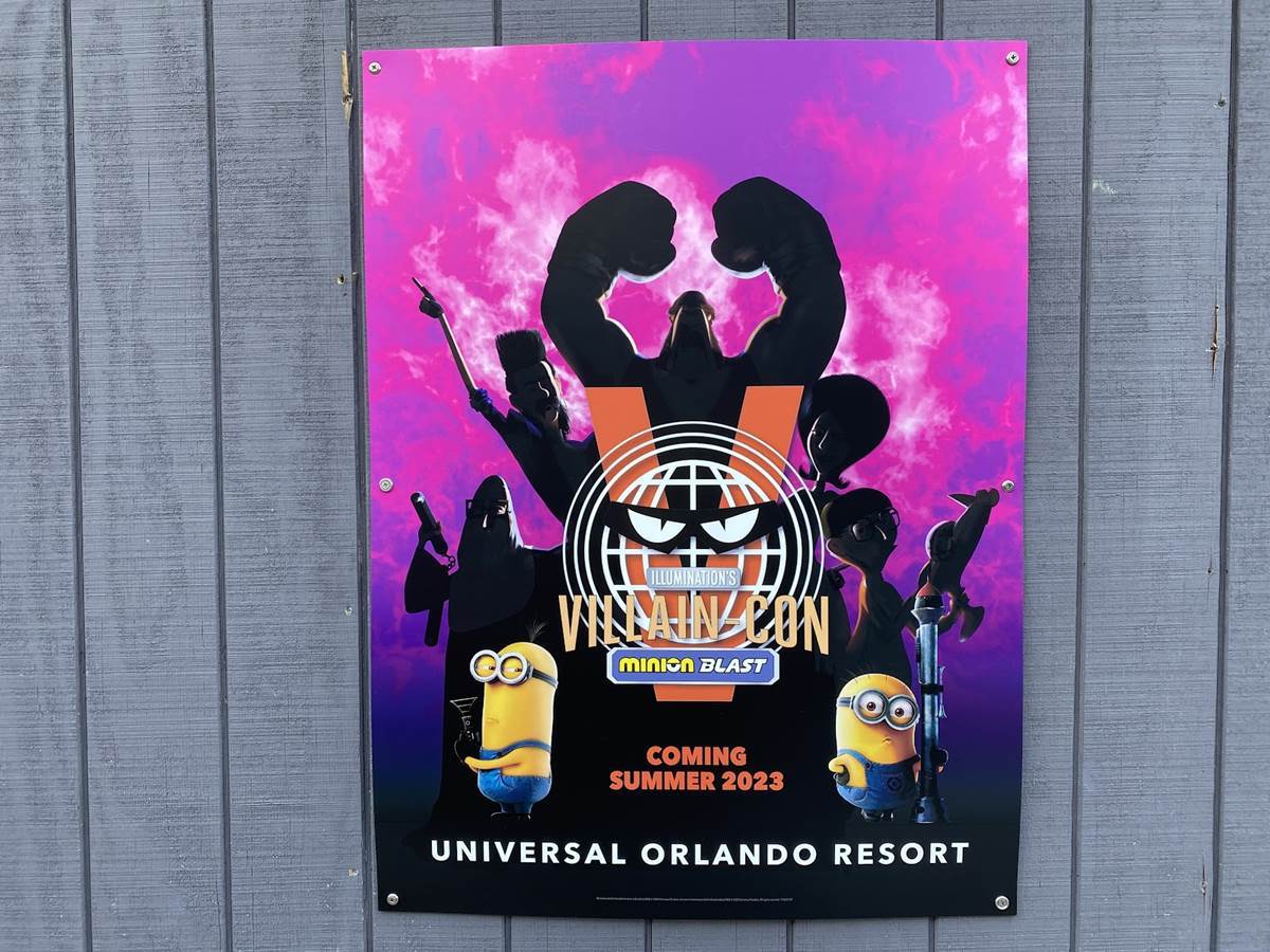 Universal Orlando’s new attraction for 2023, Illumination’s Villain-Con Minion Blast is expected to open this summer, where guests can put their skills to the ultimate test as they attempt to blast their way to supervillain stardom. Recently, new signage for the upcoming attraction was installed on its future entrance.