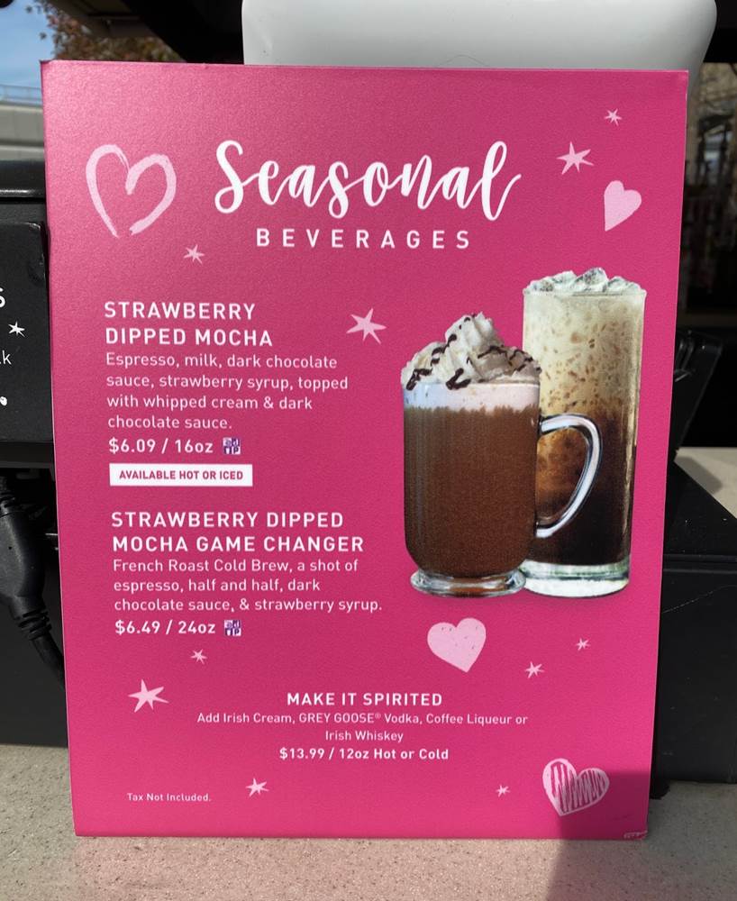 - Strawberry Dipped Mocha (Mocha with strawberry syrup, topped with whipped cream and chocolate drizzle)