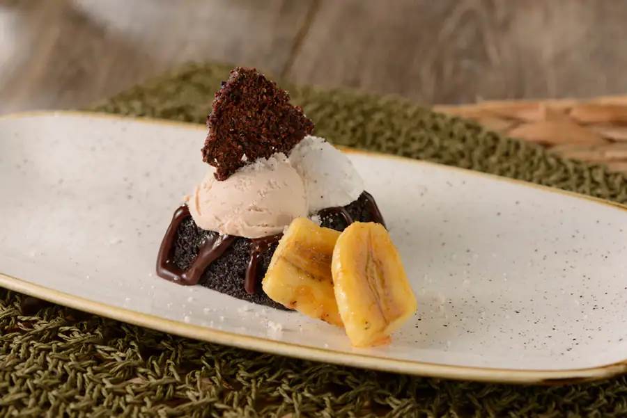 - Kungaloosh! African-inspired chocolate cake with caramelized bananas and cashew-caramel ice cream topped with coffee dust