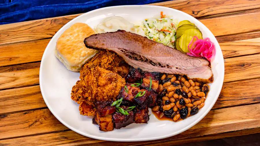 - Southern BBQ Platter: Brisket, fried chicken, burnt ends pork belly, mashed potatoes, baked beans, slaw, and a house-baked biscuit (New)