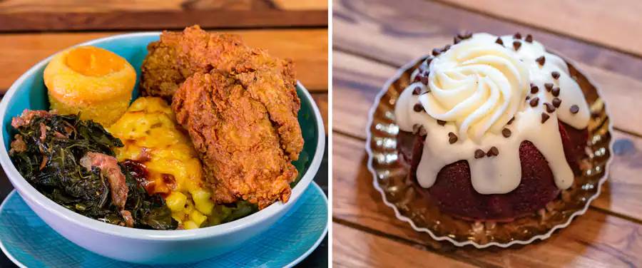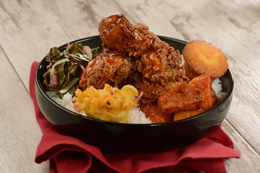- Southern Fried Chicken Bowl: Fried chicken thighs, candied sweet potatoes, rice, smoked collards, mac and cheese, and a corn muffin (New)