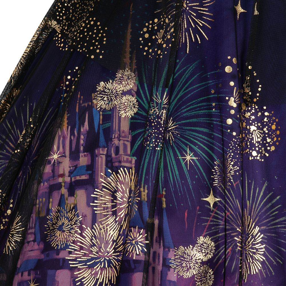 - The dress is decorated with a full Sleeping Beauty castle image and fireworks on the skirt accented with a sheer black overlay featuring golden fireworks.