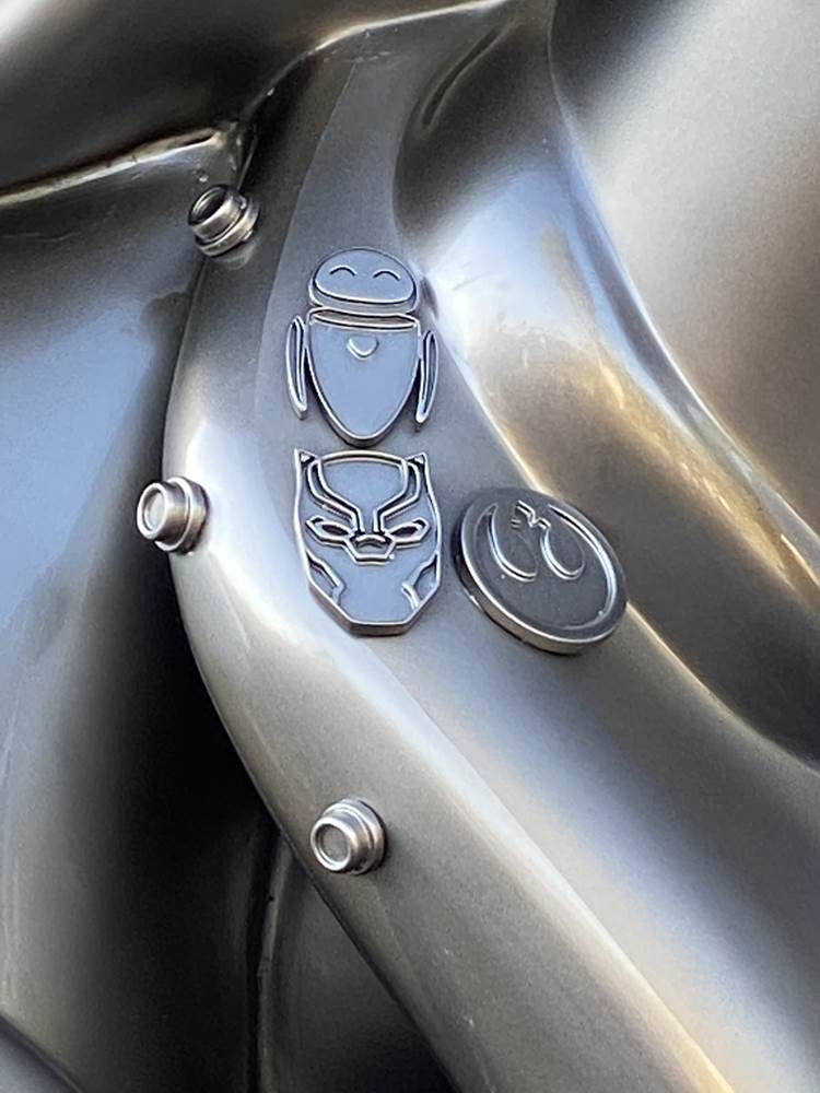 - On Mickey’s Lapel, you’ll also find his own little pins, with EVE, Black Panther, and a Rebel logo, representing Pixar Animation Studios, Marvel Studios, and Lucasfilm, respectively.